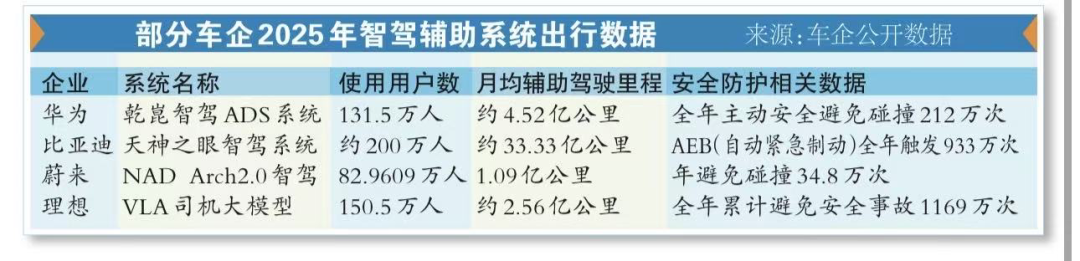 1月以来,蔚来、华为、比亚迪、理想等头部企业争相披露智驾安全出行报告,呈现出对智驾安全话语权、技术落地优势的激烈角逐态势。