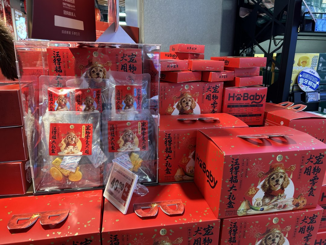 线下,各类宠物主题消费也吸引着“毛孩子”家庭前来体验。记者来到广州盒马鲜生曜一城店,一个布置得红红火火的宠物年货展柜前,围着不少顾客,很多人正在为自家宠物挑选新年礼物。展柜上摆放着“汪得福大礼盒”“毛孩子冻干压岁包”等宠物专属产品。工作人员告诉记者,这是他们第一次把宠物年货作为独立品类来推广:“给‘毛孩子’买有仪式感的年货,现在成了很多年轻家庭过年准备的一部分。传统年货我们一直在做,但创新余地不大,宠物年货正好是一个新的突破点。”