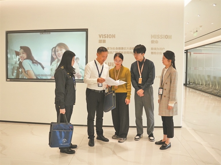 市纪委监委探索创新执法监督手段,推行“亮码入企”执法检查工作模式,以科技赋能作风建设,助力营造良好营商环境。图为海珠区纪委监委工作人员前往骑士集团了解“亮码入企”和职能部门涉企服务情况。