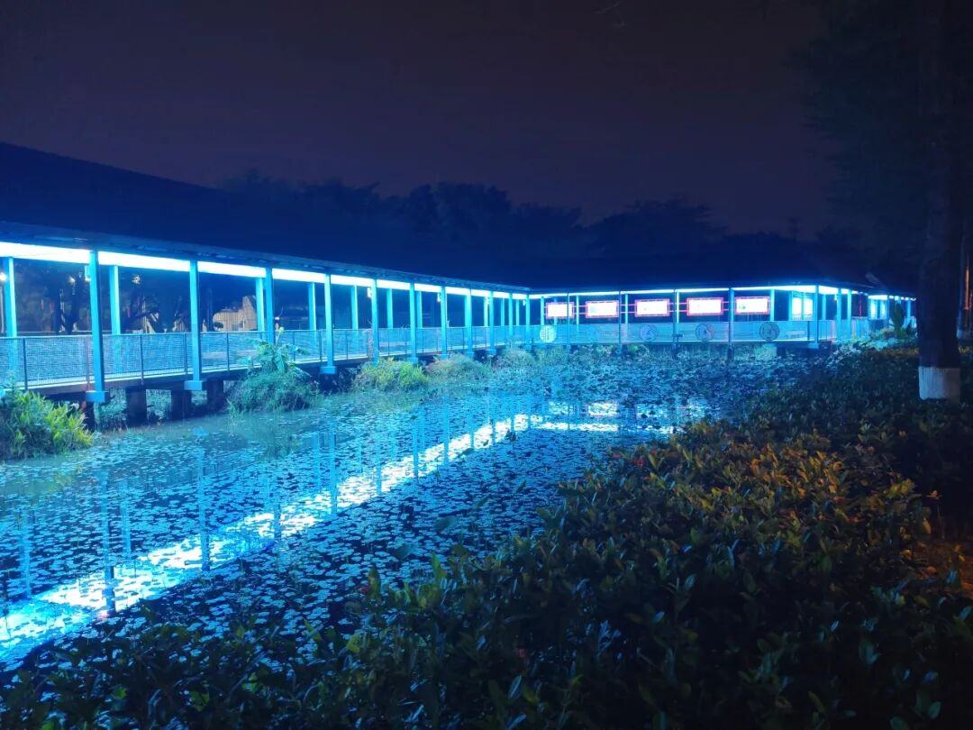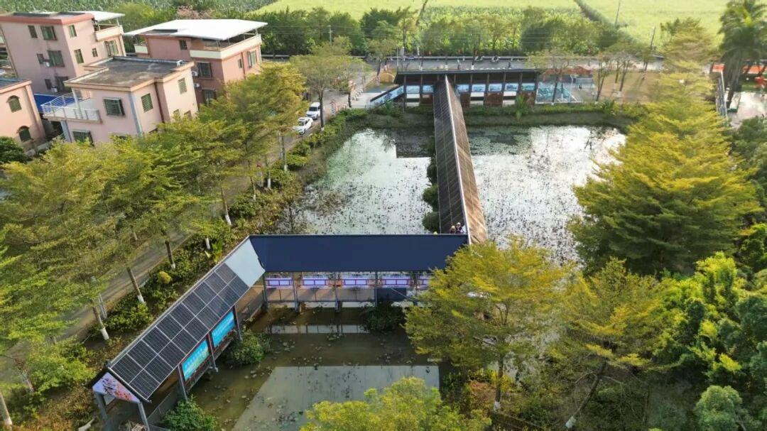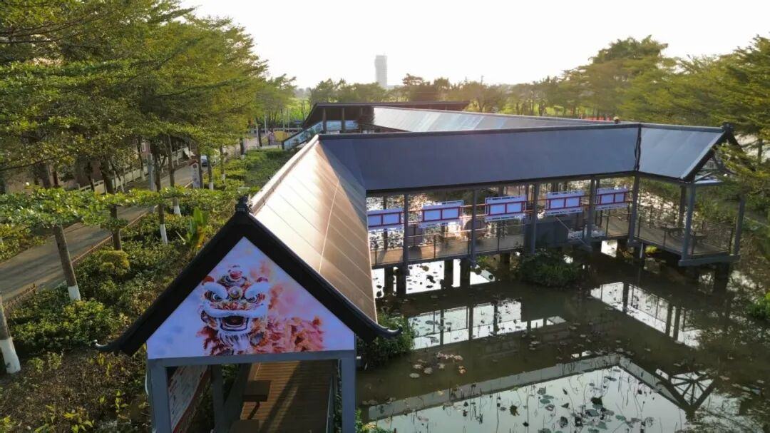 走进马克村绿化公园,原来老旧的湖心桥摇身一变成为光伏长廊。这不仅是联合实验室的“零碳景观”示范,更是文旅融合的典范。长廊的设计巧妙融入了岭南风格和醒狮元素,顶部镶嵌着星空灯箱。