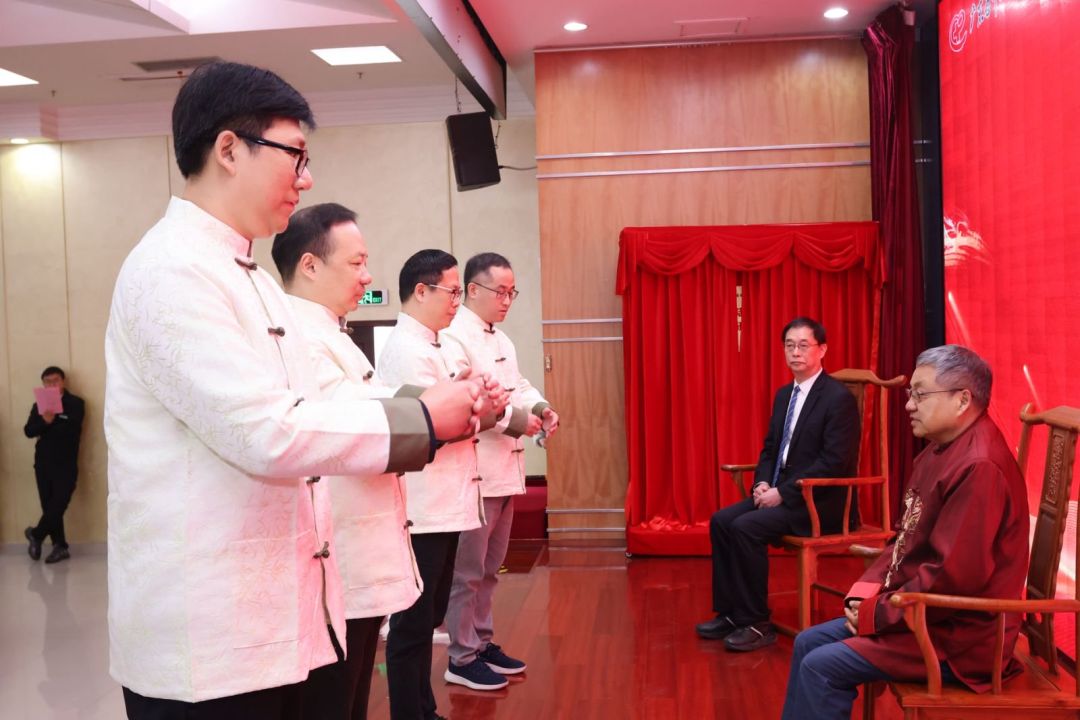 仪式现场,王新陆国医大师与广东省中西医结合医院负责人共同为工作室揭牌。金色牌匾缓缓揭开,标志着以“血浊”理论为核心的学术传承与创新平台正式落地佛山。随后举行的拜师仪式环节,医院遴选的4名骨干医师代表身着弟子服,怀着崇敬之心向王新陆国医大师行拜师礼,敬茶、献花、宣誓,一系列传统礼仪承载着中医药传承的庄重使命。王新陆大师向弟子们深情寄语,勉励弟子们须以精诚立心,以医德育人,既传诊疗绝技,更授医者初心,现场掌声雷动,尽显岐黄薪火代代相传的动人景象。