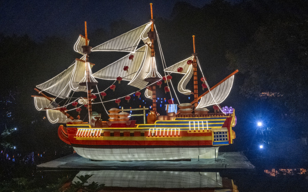 “海丝扬帆”灯组,精准复原历史上著名的瑞典“哥德堡号”商船,再现广州千年海丝贸易的繁盛景象。
