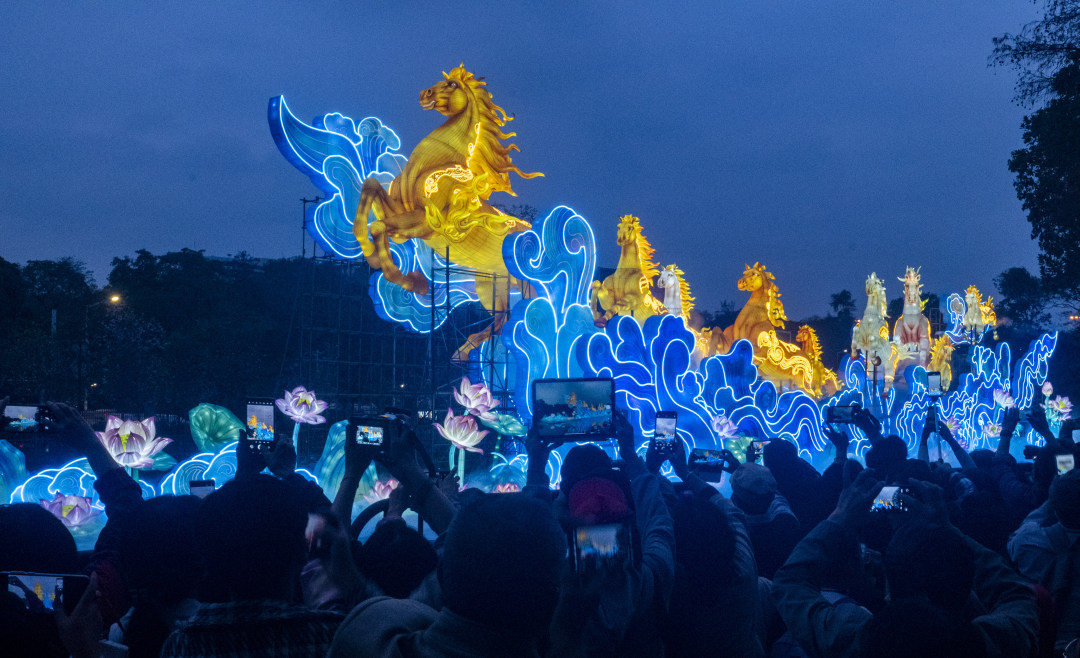 市民游人纷纷拍摄“万马奔腾”大型灯组。