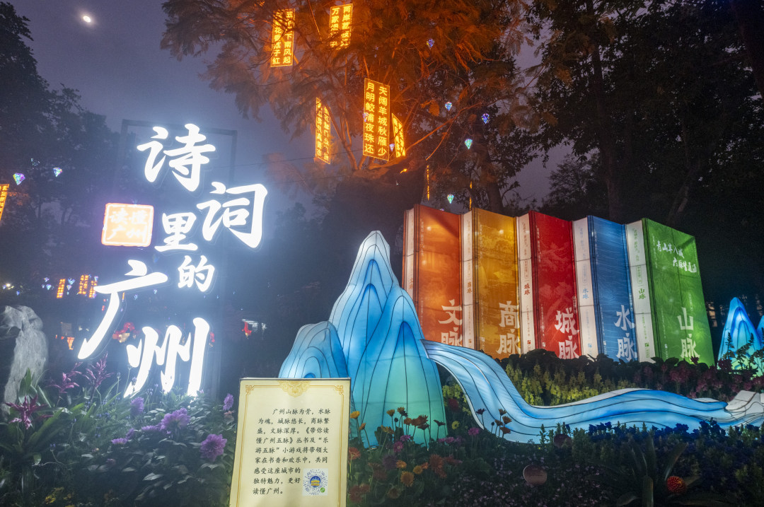 “潮涌古今·风尚客厅”灯组群,以“诗词里的广州”为主题构建了一个移步换景、可赏可玩的光影美学空间。