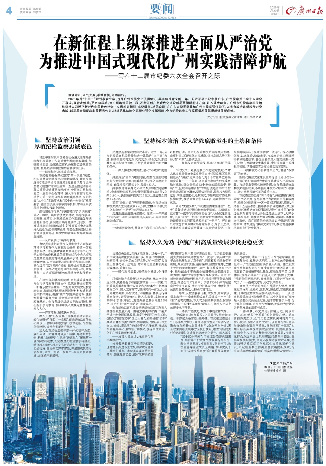 山海寻梦,不觉其远;前路迢迢,阔步而行。2026年是“十五五”规划开局之年。站在新的历史起点,全市纪检监察机关将时刻牢记初心使命、胸怀“国之大者”,以更高标准、更实举措推进全面从严治党,围绕实现“十五五”时期目标任务做深做实政治监督,巩固拓展深入贯彻中央八项规定精神学习教育成果,持续深化群众身边不正之风和腐败问题集中整治,强化监督执纪问责,坚定不移推进反腐败斗争,持续加强纪检监察工作规范化法治化正规化建设,以纪检监察工作高质量发展的新成效,为中国式现代化建设的广州实践提供坚强保证。