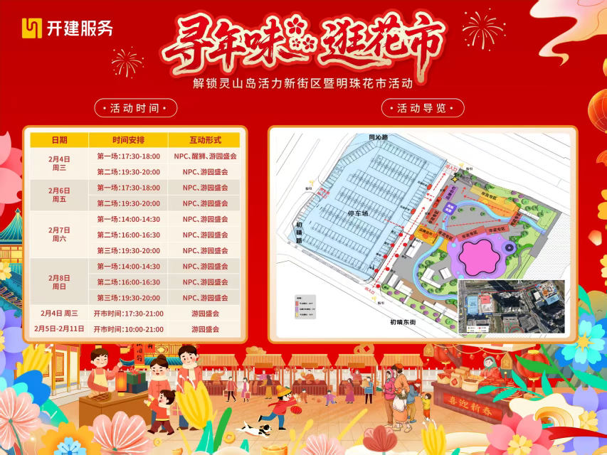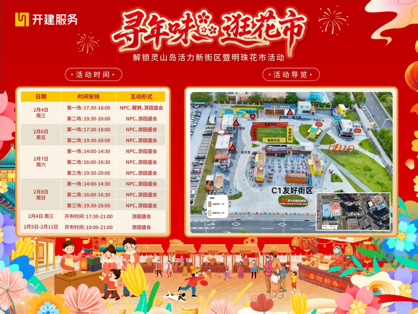 作为明珠湾首届花市,本次活动打造了五大游园线路,串联两大街区,并设置非遗手作、文创特产、年货市集等特色摊位,打造集民俗体验与商业消费于一体的综合性活动,满足市民一站式购齐年货的需求!现场更有财神派利是、卖花郎赠香、媒婆送喜,还特别设置专属“新春交友墙”为广大市民朋友解锁全新“行花街”体验。