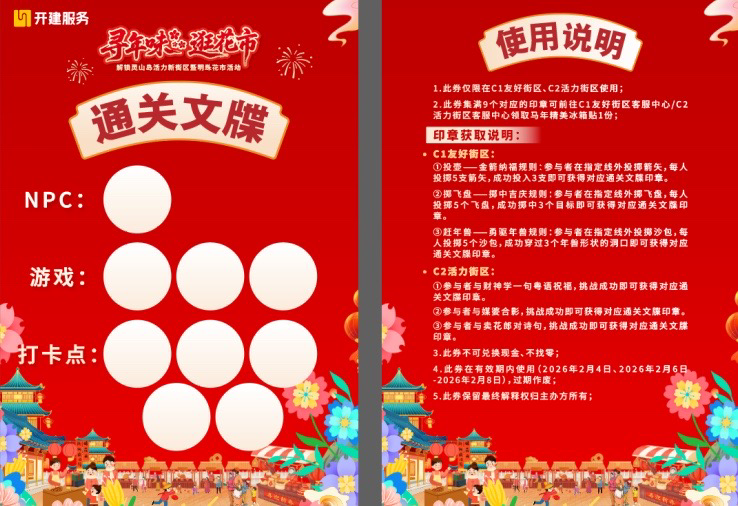 在任一街区客服中心领取“花市通关文牒”,完成以下任务并集满九枚印章,即可兑换马年限定冰箱贴!奖品每日限量,先到先得,手慢无~