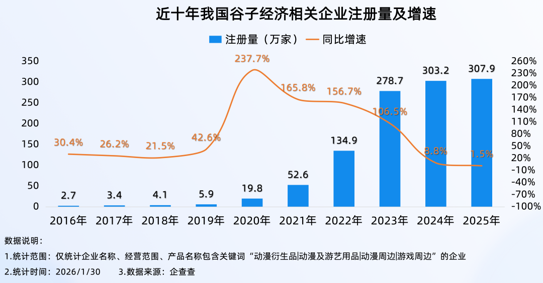 据某企业信息查询平台显示,2023年以来,我国谷子经济相关企业每年注册量在270万家至310万家之间,2025年全年,我国累计注册307.9万家谷子经济相关企业,创近十年相关企业注册量新高;其中2025年华中地区相关企业注册量最多,占比38.4%;企业存量方面,截至1月30日,我国现存775.8万家谷子经济相关企业。