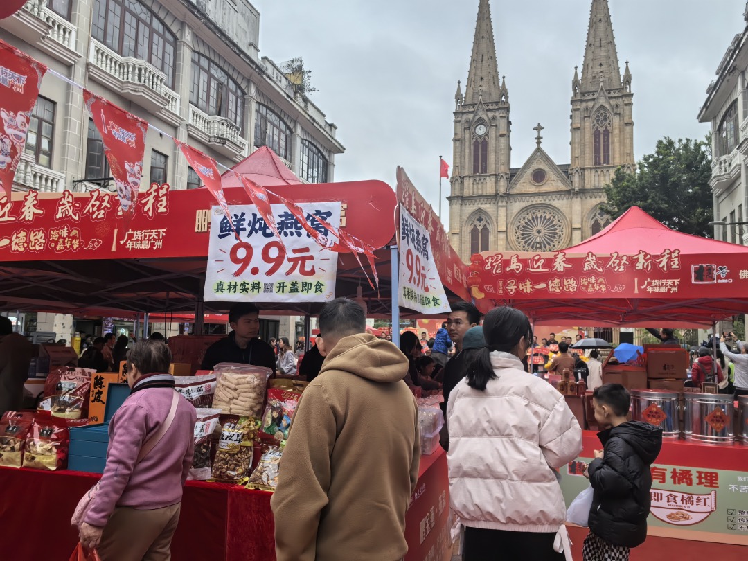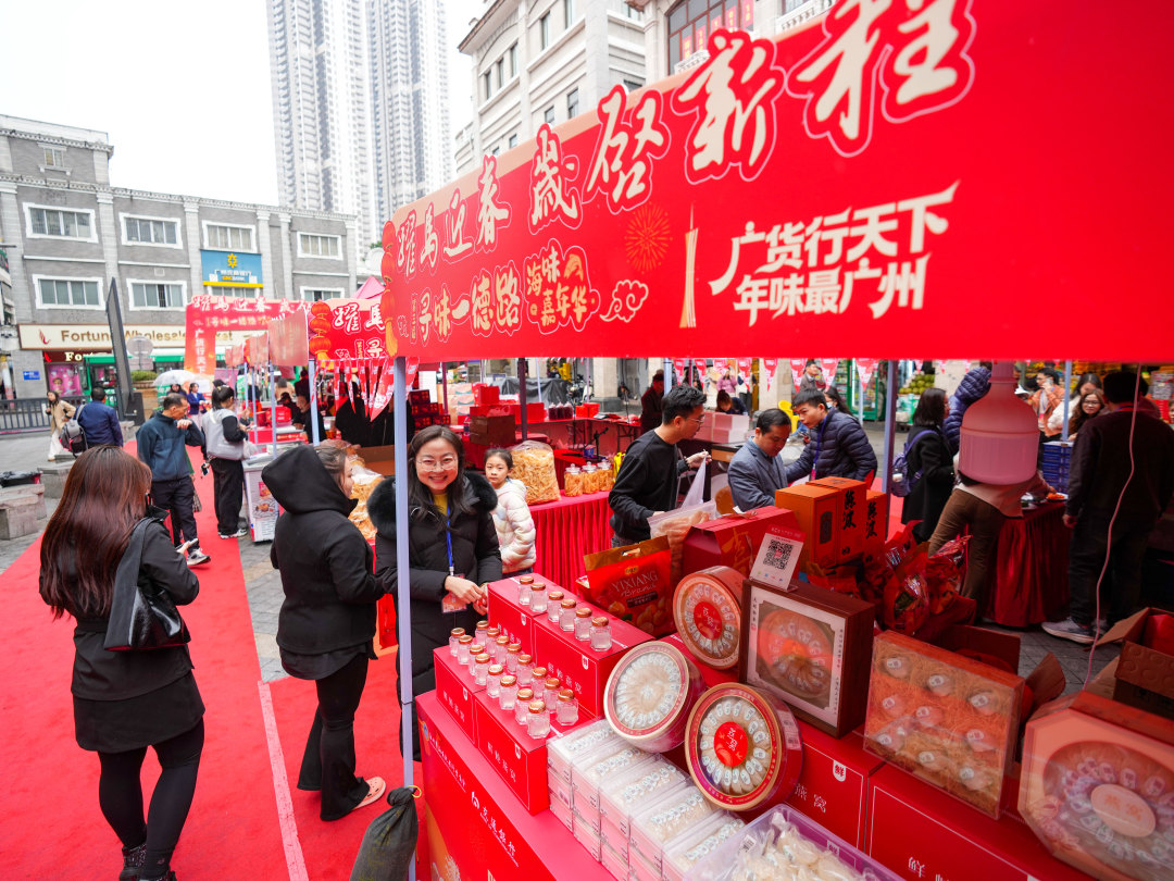 活动当天,石室广场香气氤氲,鲍参翅肚、干果坚果、即食海味等各类广府年货琳琅满目,14家参展企业携优质产品亮相,吸引了大批市民游客驻足选购,展销区人头攒动、年味十足。参展企业中,吉膳堂、映参堂、合崇珍、溏膳源、悦栈、呼咖等一德路品牌与众多大湾区知名企业共同带来特色好物,全方位满足市民的年货采购需求与味蕾期待。