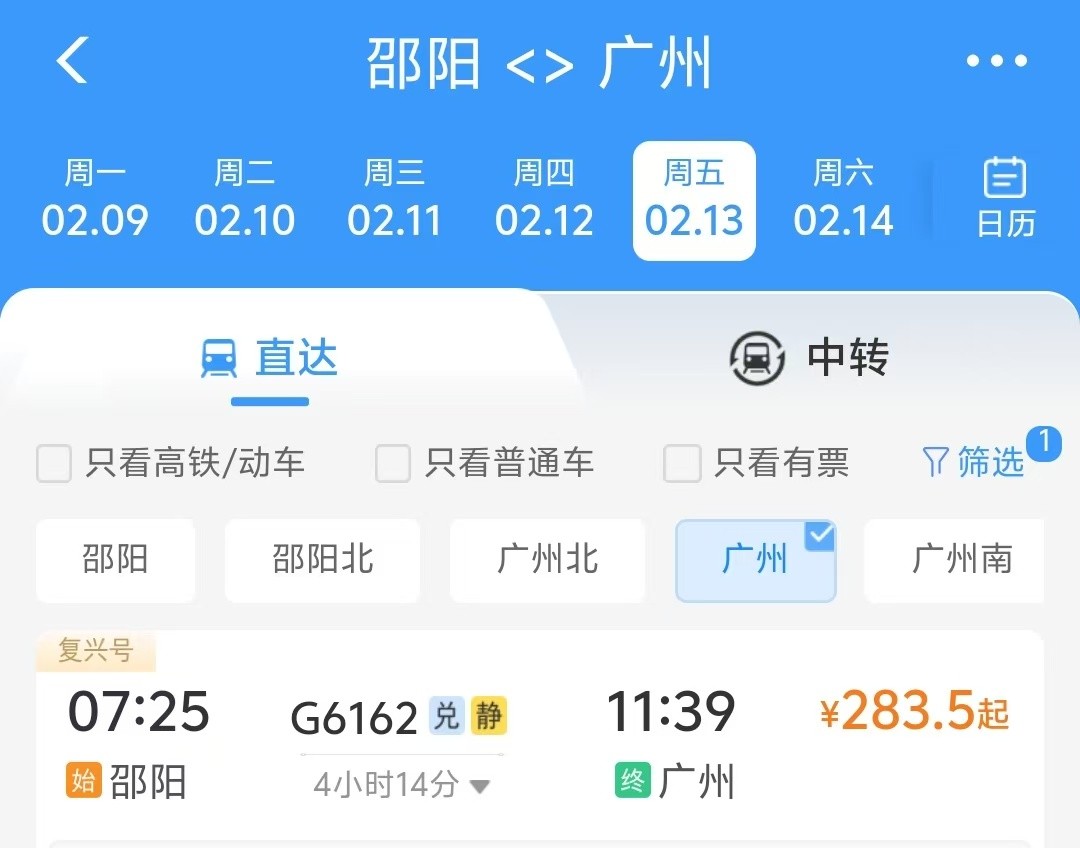 邵阳站至广州站的G6162/59次高铁列车二等座票价为283.5元;