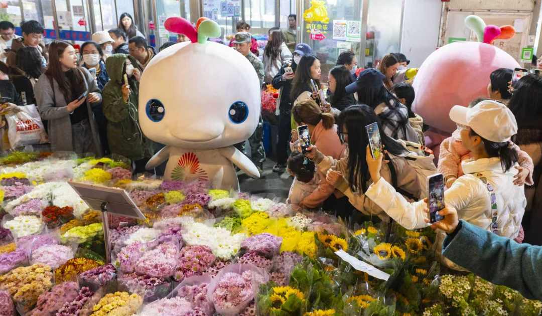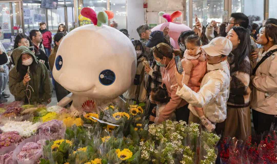 当天下午,十五运会吉祥物“喜洋洋”“乐融融”惊喜现身,陪同大家徜徉花海,将嘉年华氛围推向高潮。“没想到在市场买花,意外地遇到了‘大湾鸡’,大家都好兴奋!”街坊黄女士说,希望在花市等广州传统活动上,能多多见到“大湾鸡”的身影。