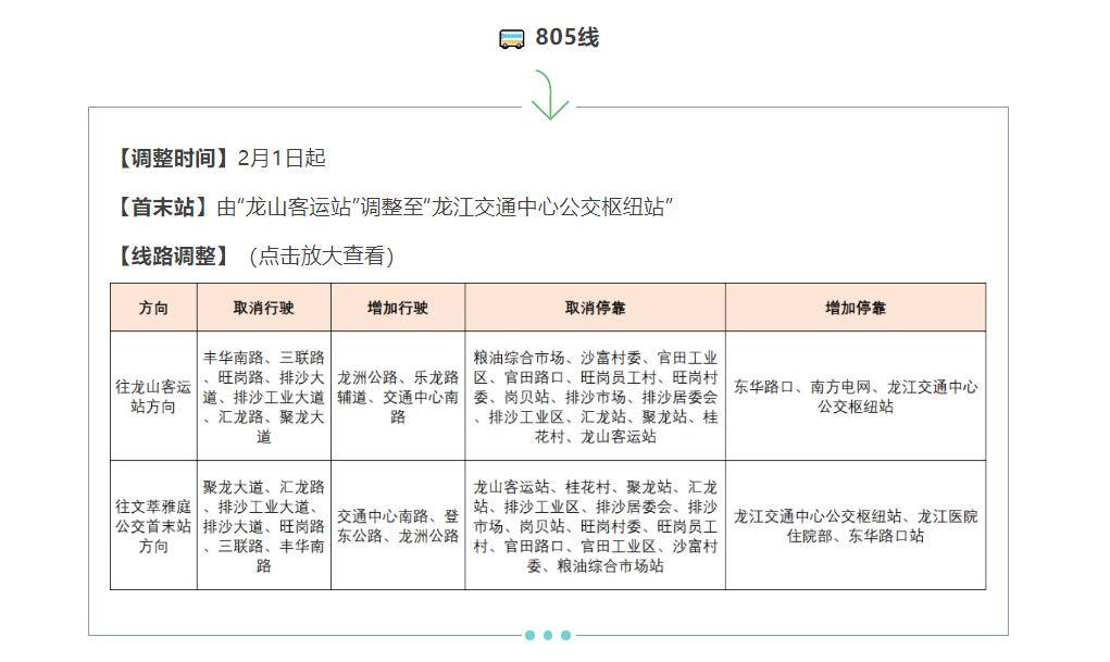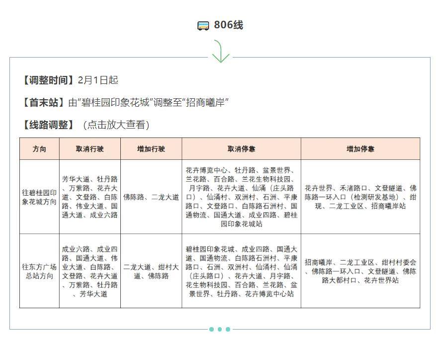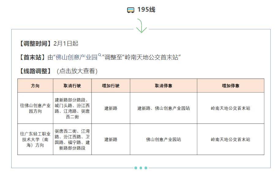 另外,从2月1日起,佛山公交195、806、805线路实施优化调整。其中,195线首末站由“佛山创意产业园”调整至“岭南天地公交首末站”;805线首末站由“龙山客运站”调整至“龙江交通中心公交枢纽站”;806线首末站由“碧桂园印象花城”调整至“招商曦岸”。