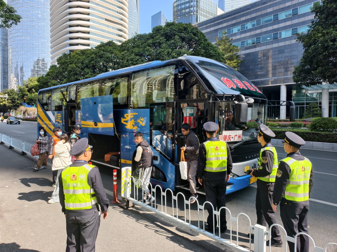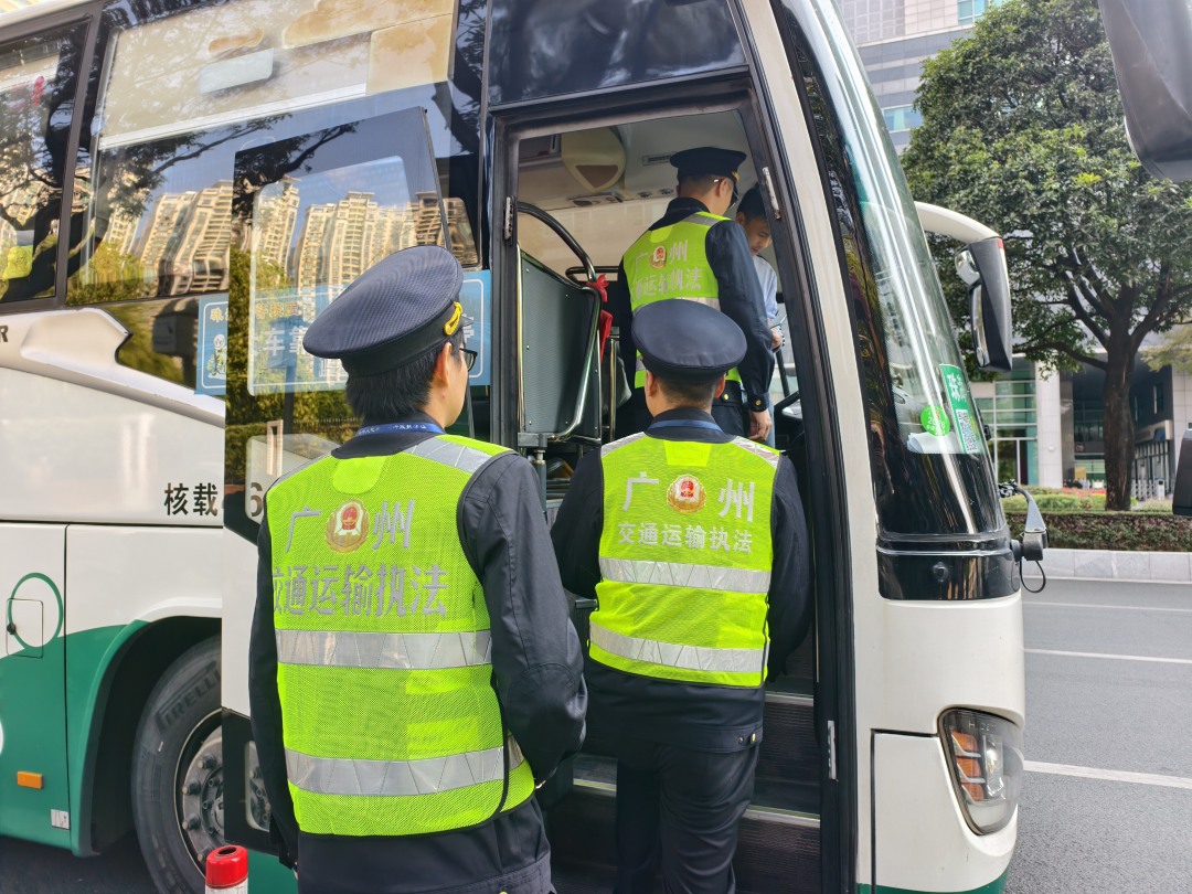 广州东站汽车客运站珠江新城停靠点,交通执法人员对客运车辆进行检查。