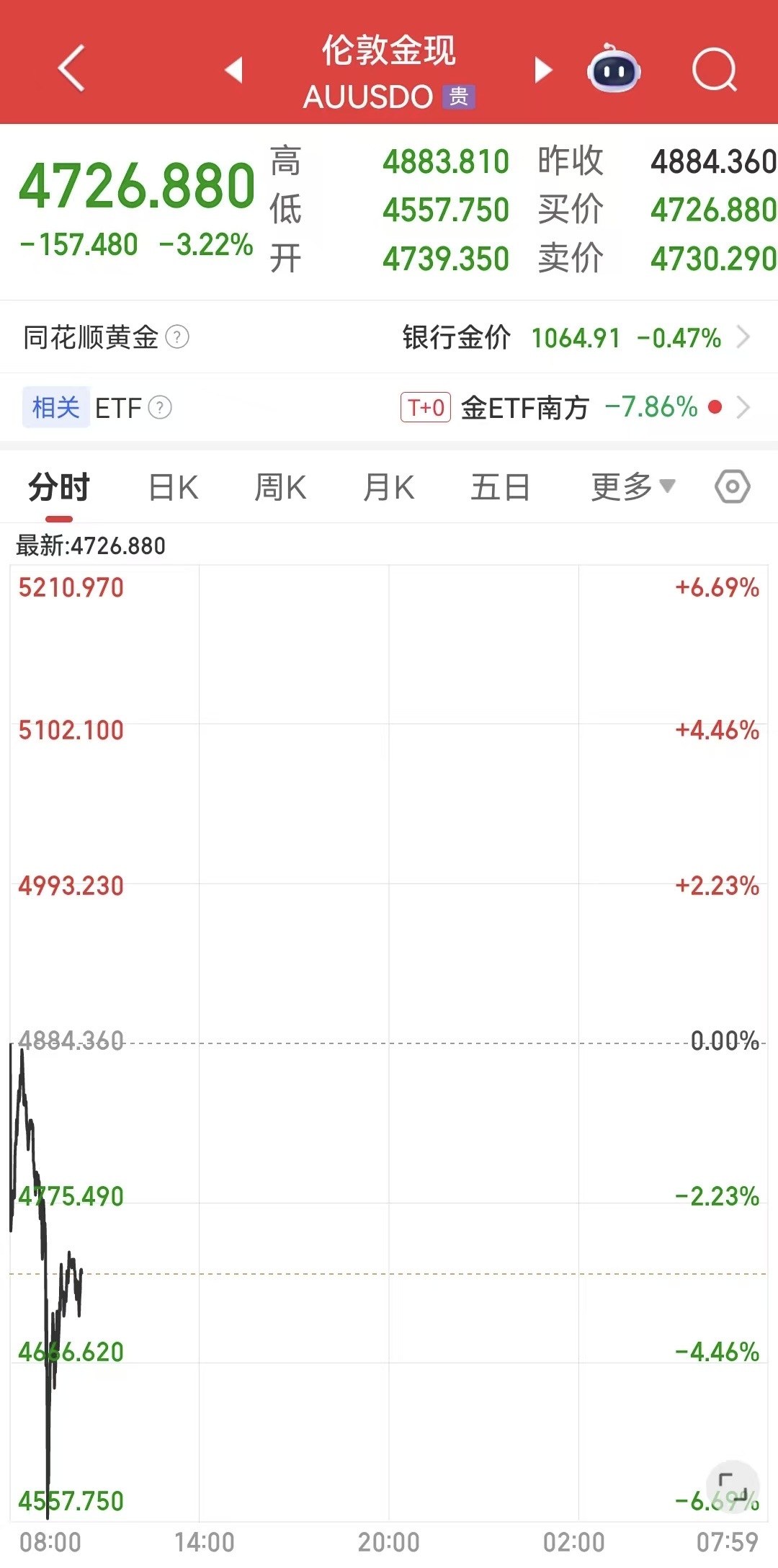 截至10时15分,黄金和白银再次出现大跳水,现货黄金失守4590美元关口,一度下探4557美元/盎司,现货白银也一度失守80美元关口。