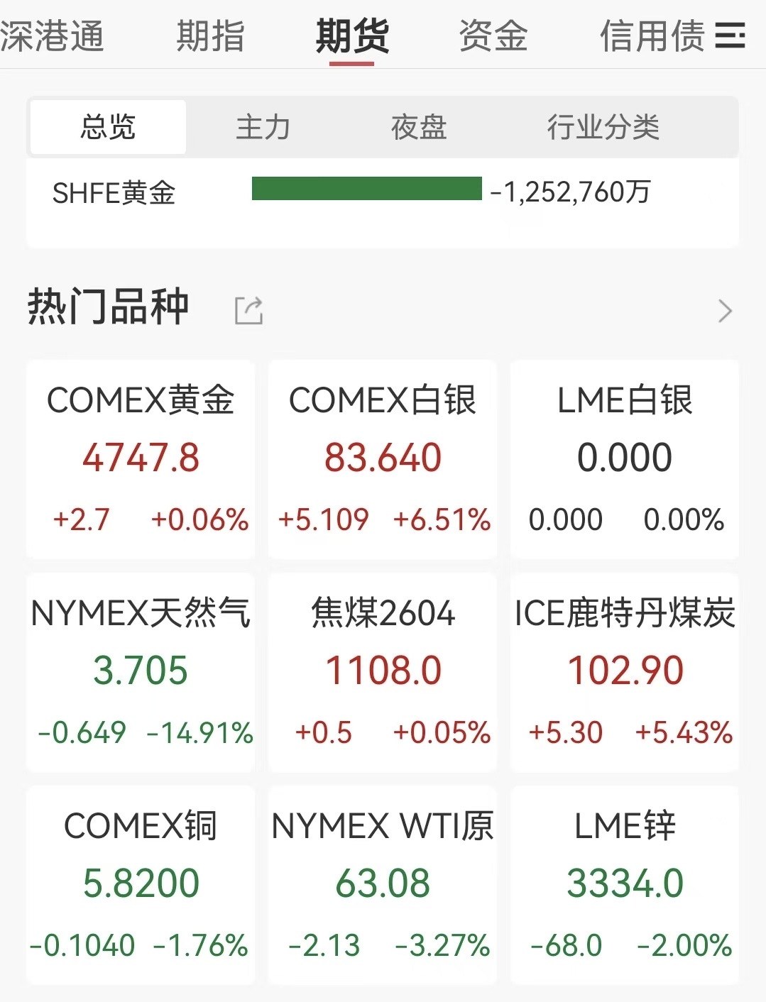 截至10时19分,COMEX黄金下跌后又快速上调至4747.8美元/盎司,涨幅0.06%,COMEX白银期货涨超6%,报83.64美元/盎司。