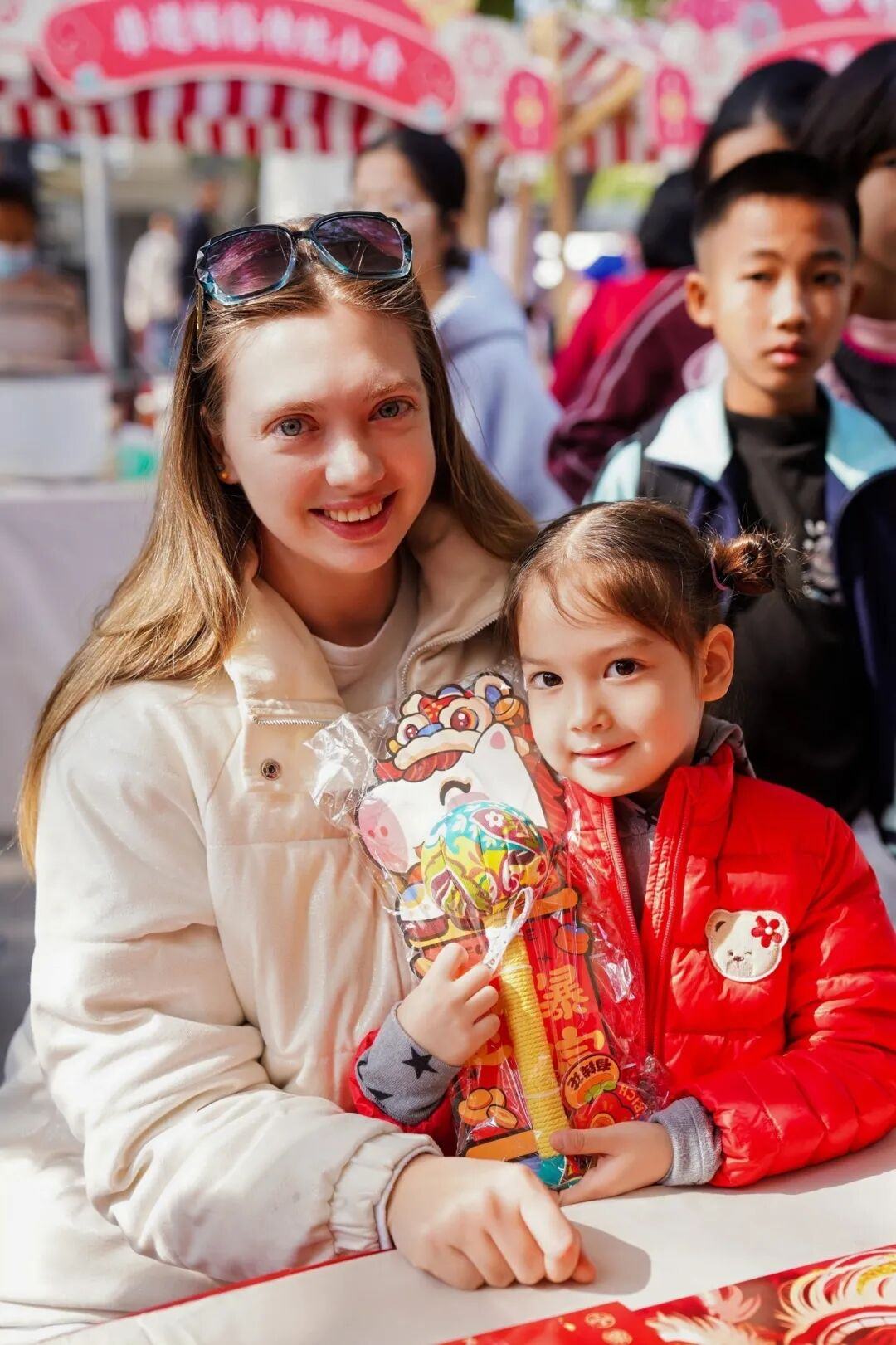 在非遗拓印红包的摊位前,外国友人Vita正带着孩子体验拓印红包,只见将拓印模板放在红包上,再用小工具蘸上金漆一点点印上去,即可轻松收获精致的红包封面。“我觉得今天的活动很丰富,有很多东西买,也有很多东西玩,年味满满。”Vita开心地说道。