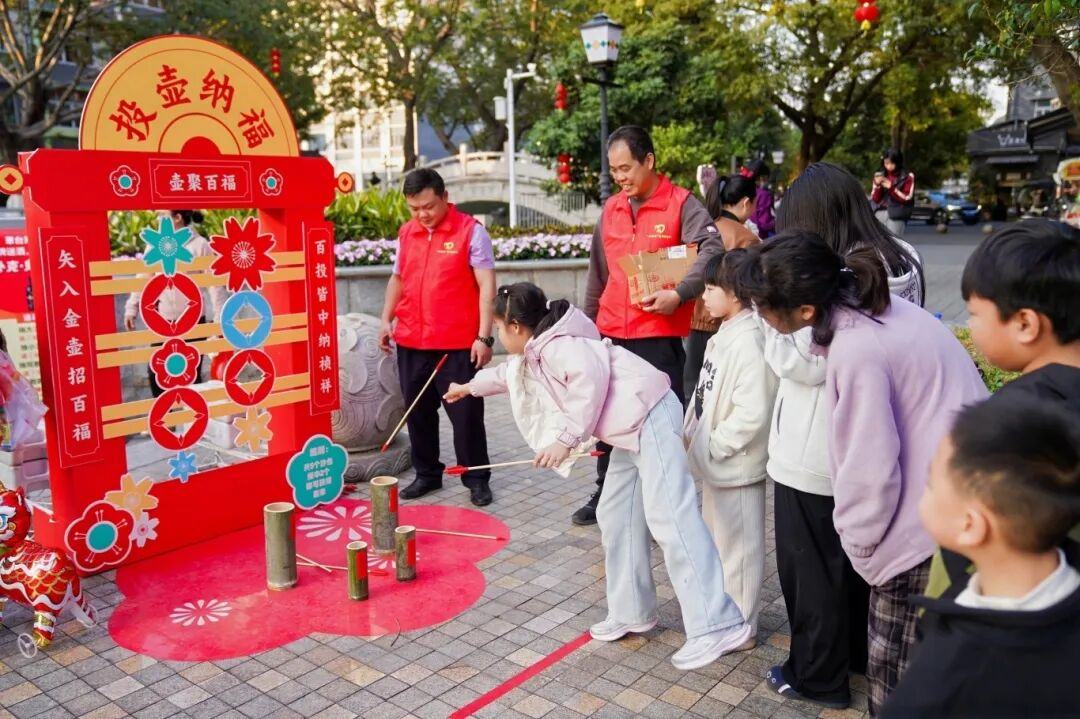 福满新春趣味游园区设置了投壶纳福、招财进宝等六大互动游戏,大小朋友通过集章打卡兑换新年好礼,现场欢声笑语不断,年味十足。现场亦有融合水乡风情的快闪表演精彩上演,展现了东涌基层的蓬勃活力。