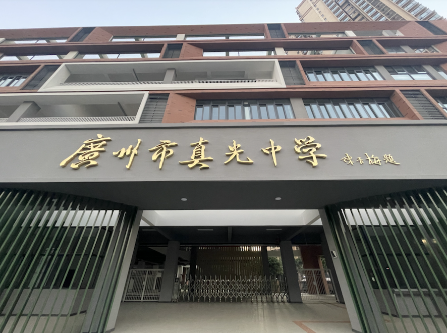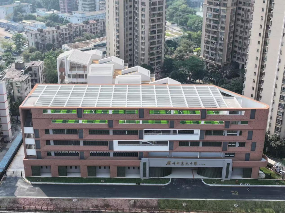 新学校建筑外立面以经典的红白配色构成,色彩对比鲜明,风格沉稳而富有活力。校门处,“广州市真光中学”七个大字格外醒目。从高空俯瞰,校园整体布局呈现出一个三角形态,颇具设计感。