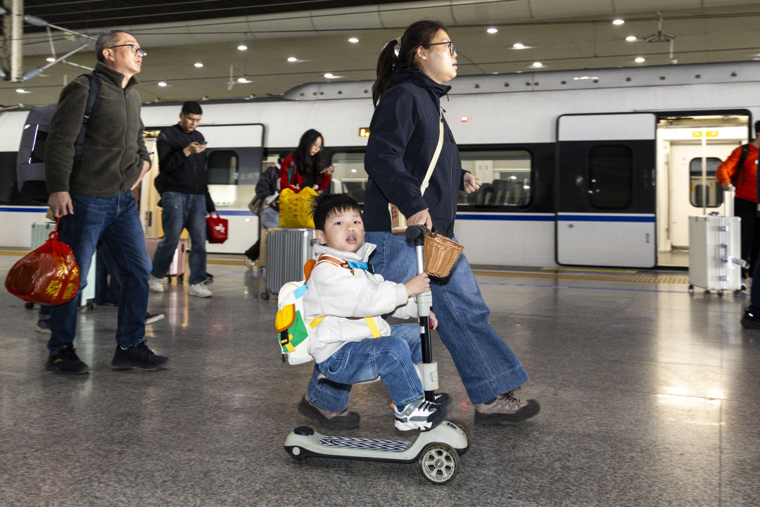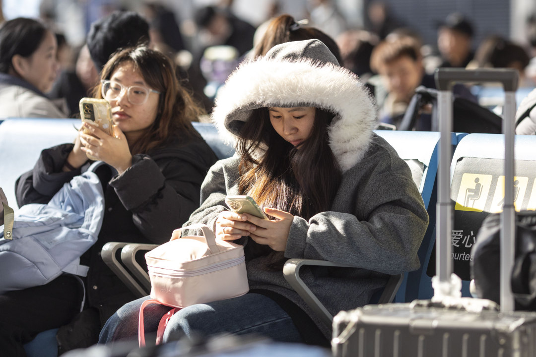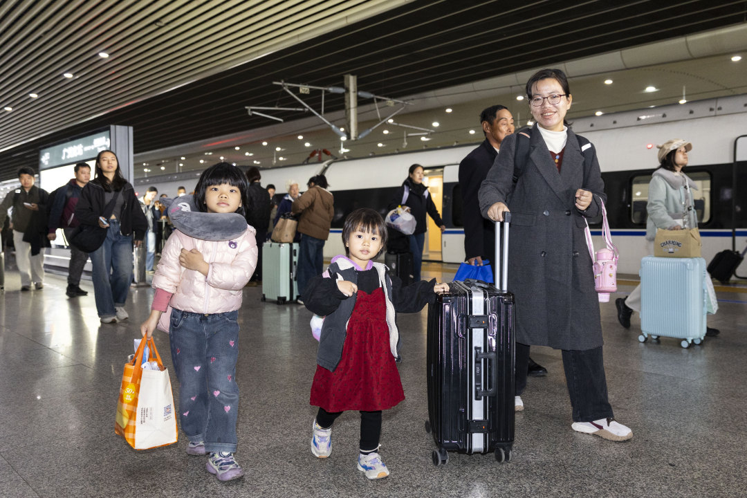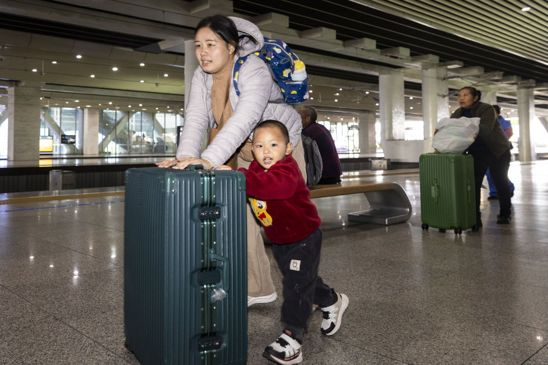 旅客穿着厚厚的冬衣踏上春运旅程。