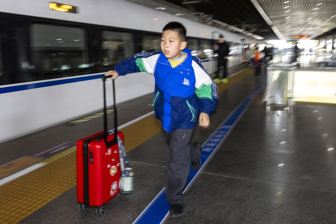 广州南站月台,小朋友推着行李箱小跑赶车。