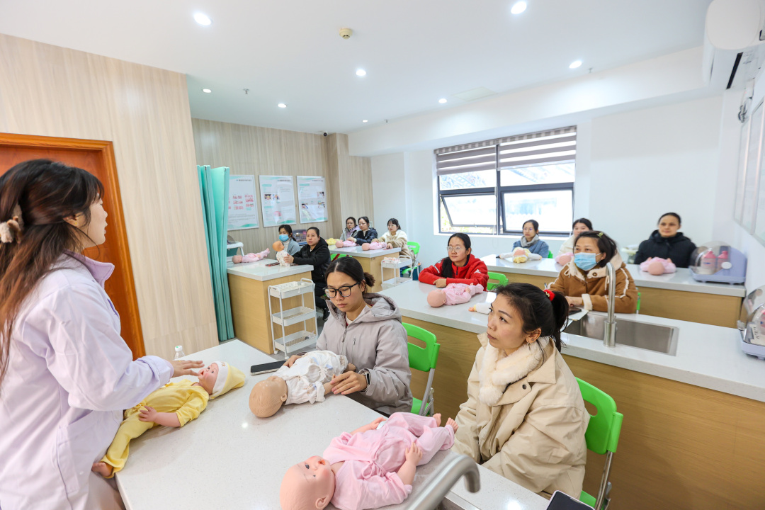 养育照护实训室里,治疗师向准妈妈们演示怎样进行婴幼儿抚触,以及怎么做小儿推拿的治疗。除了培训准妈妈,这里还开展育婴师、保育师和婴幼儿发展引导员的实操培训。目前正在进行中医治疗师实训。“这里的条件真好,各方面的需求都充分考虑到。”调研组成员点评道。