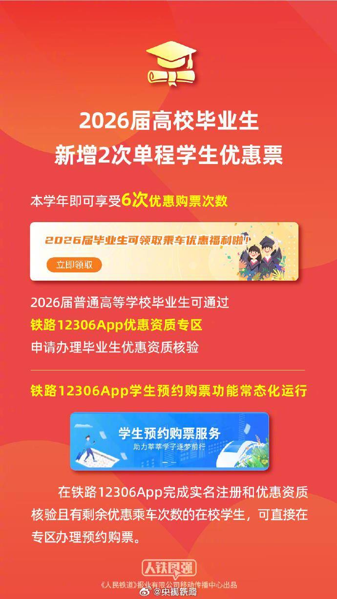 近日,国铁集团联合教育部、人力资源社会保障部等多部门出台新规:2026届高校毕业生新增2次单程学生优惠票,本学年即可享受6次优惠购票次数。