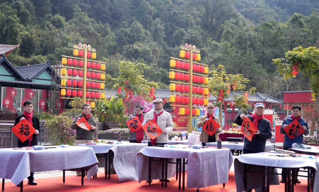 接福帖、贴春联是春节的传统习俗,作为粤港澳地区知名的福山胜境,观音山多年来坚持在新春来临之际举办挥春送福活动,为市民游客免费送上手写的新春祝福,这一传统也成为景区迎新春的特色活动。