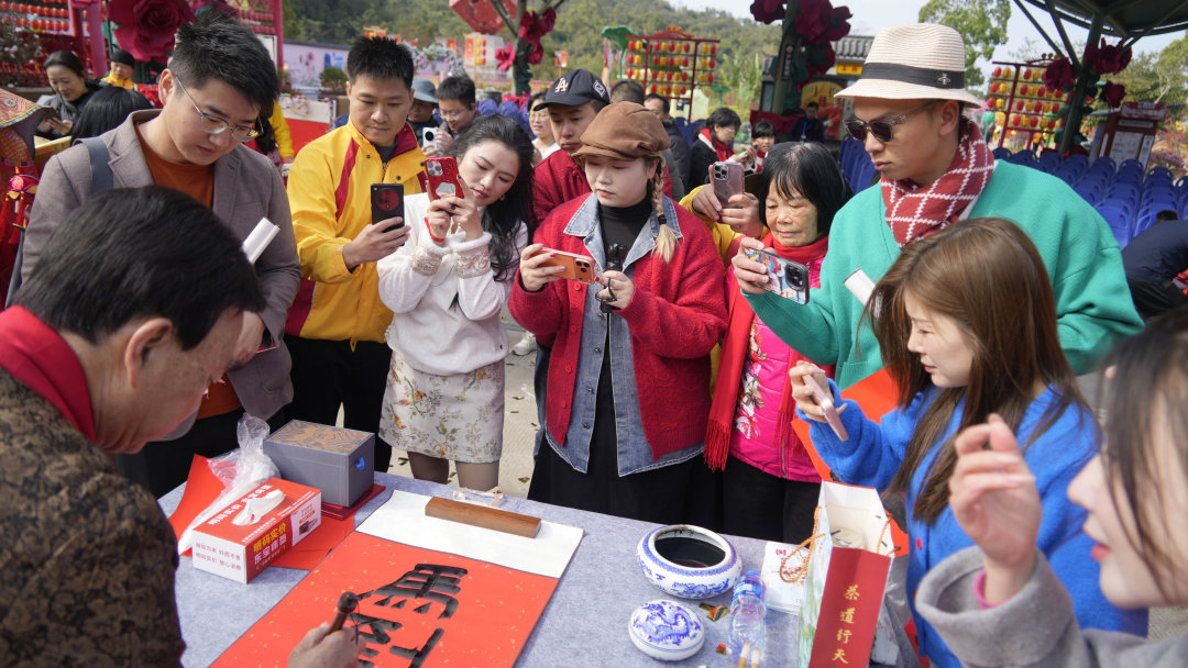 “带着孩子来逛观音山,恰巧遇上挥春送福活动,拿到书法家手写的福字贴,墨香十足,把‘福’带回家特别有意义。”现场一位游客一边晾晒福字贴,一边笑着说。东莞本地游客陈先生则表示,手写春联比印刷品更有年味,“把这副春联贴在家门口,年的味道就真的来了”。闺蜜组团、情侣牵手、全家同行,现场各式各样的身影汇聚成热闹的新春图景,福山之上,墨香与年味交织,暖意融融。