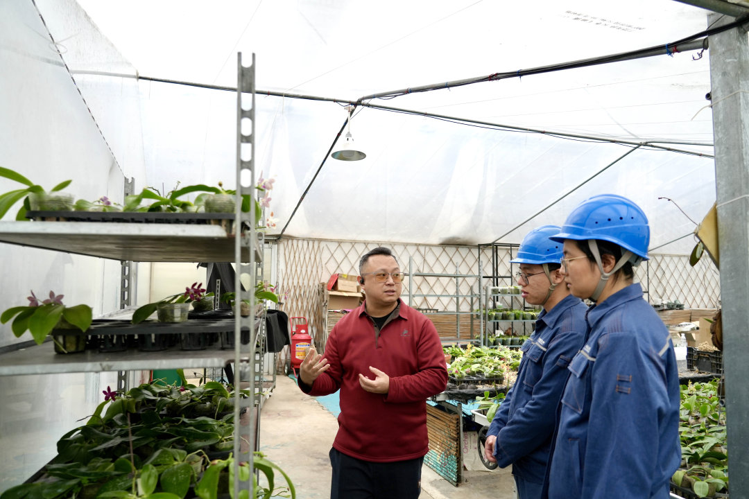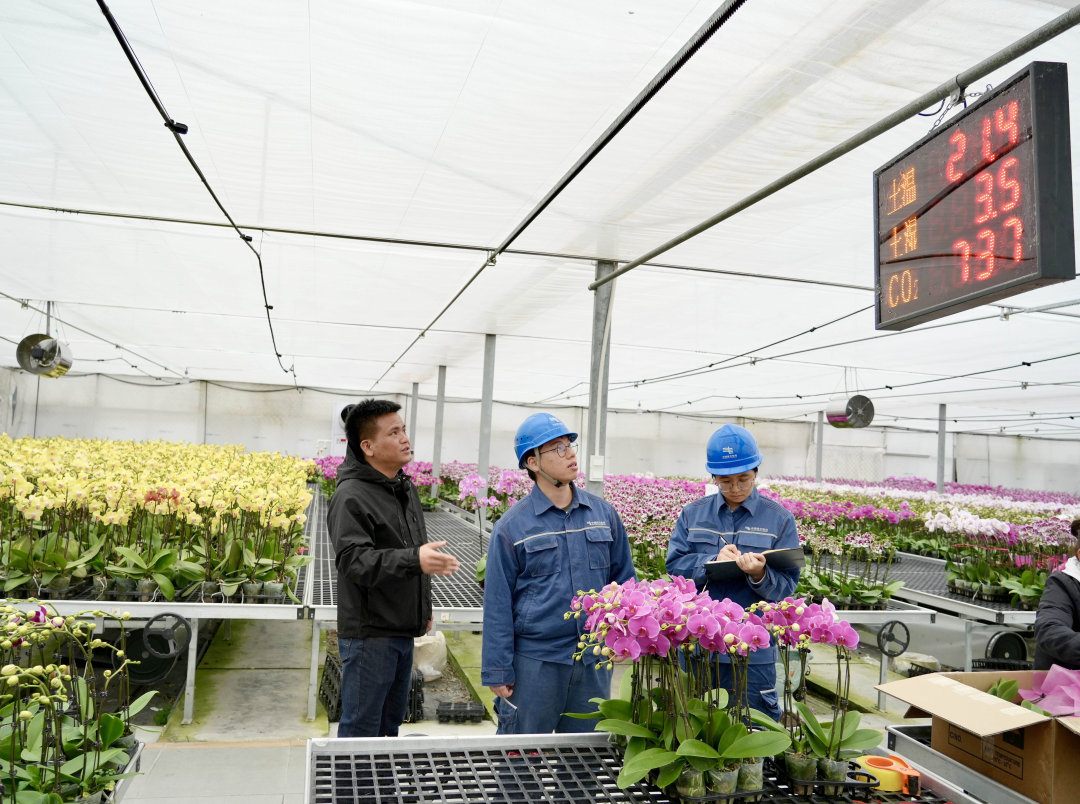 南方电网广东佛山南海供电局里水供电所工作人员正在向蝴蝶兰培育基地负责人了解兰花培育用电需求。