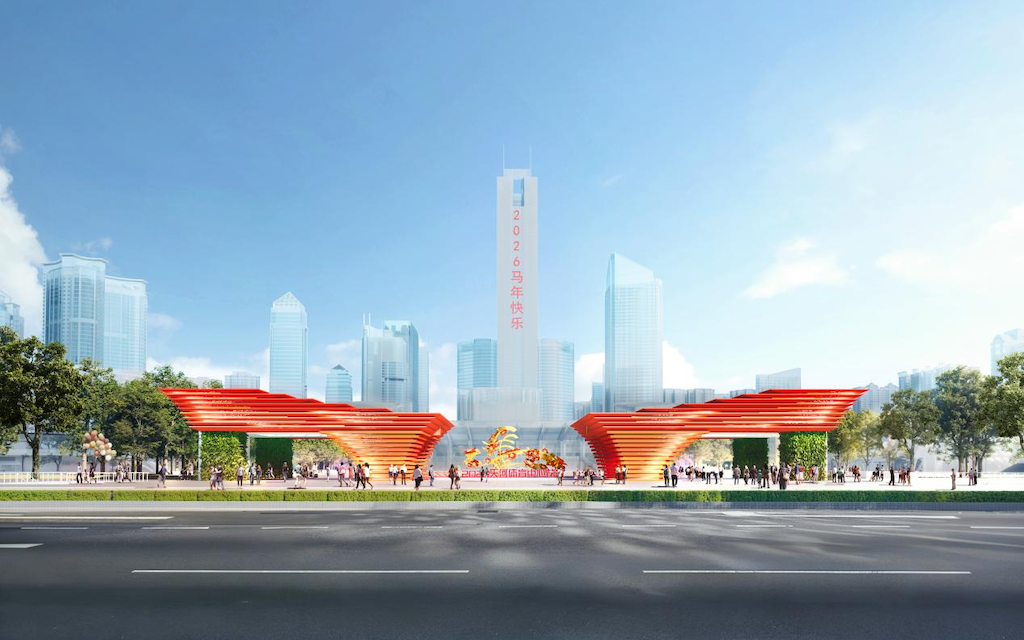 骏马嘶风,新春将至。备受关注的2026年天河区迎春花市牌楼目前正进入紧张的工程施工阶段。其设计图也首次面向公众曝光。
