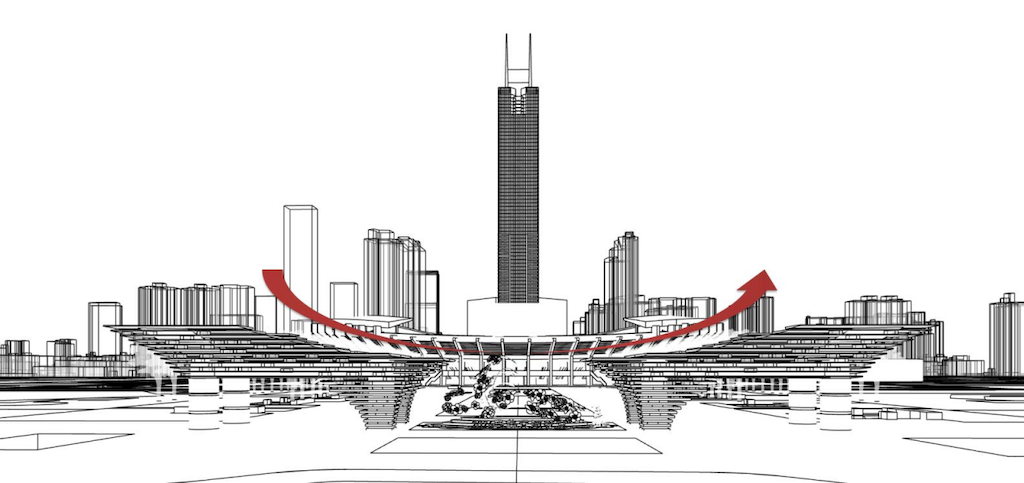 牌楼设计将艺术创想与文化内涵完美契合。主体结构以天河体育中心南广场两座既有复建的两座历史门楼为基础,以“风鹏正举·飞马亮翼”为造型意象,微弧形的檐口天际线呼应体育中心“天体”的碗状轮廓,浑然一体,宛若天成,整体造型舒展而富有动势。