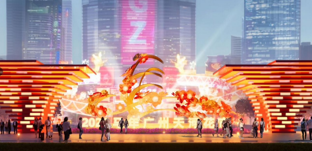 2026年天河区迎春花市以牌楼为起点,采用与城市中轴线对称的布局方案,沿中心花海次第铺展、层层深入,最终汇聚于花海尽端的全运主题景观区,整体空间环环相扣、意境贯通,寓意“马到功成”。