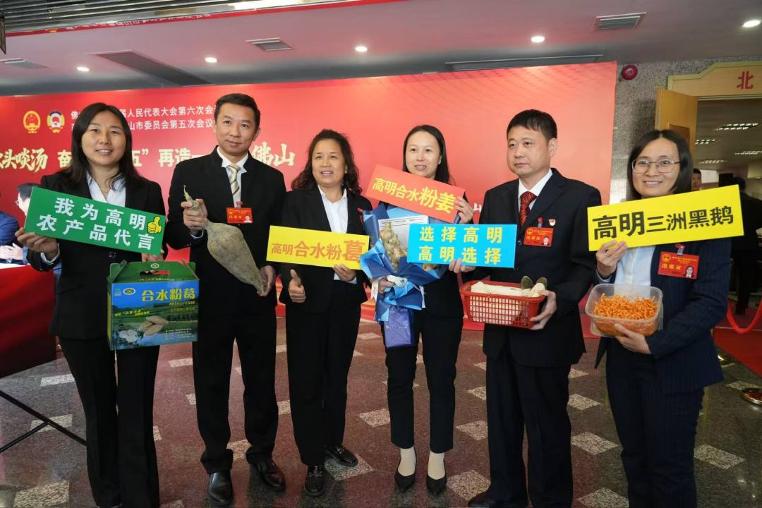 六名来自高明区的市人大代表手捧粉葛、竹荪、虫草花等农产品,热情地向参会人员介绍,将严肃的会议间隙变成了一场充满乡土气息的农产品展示会。