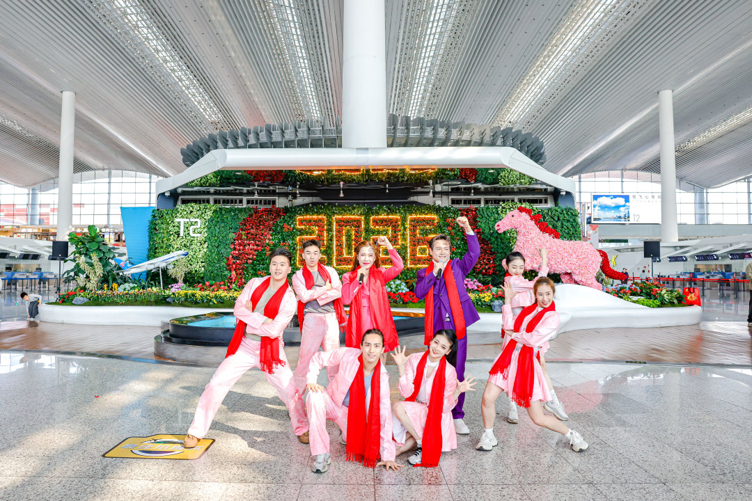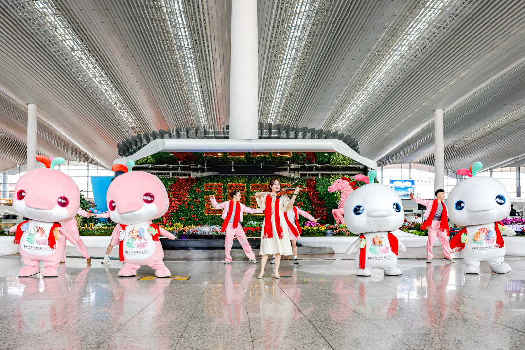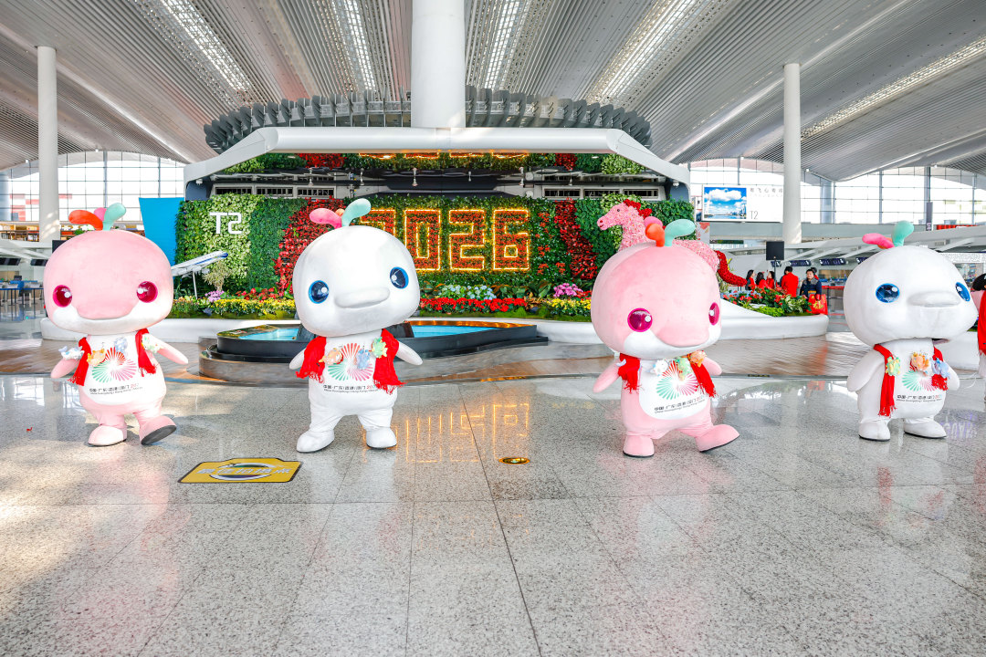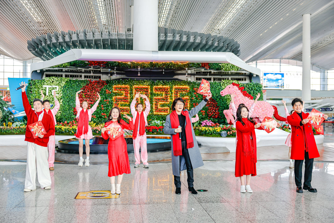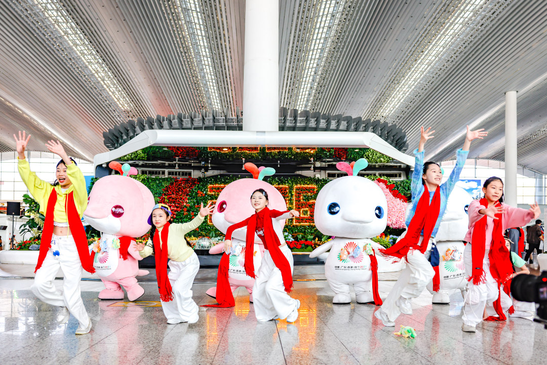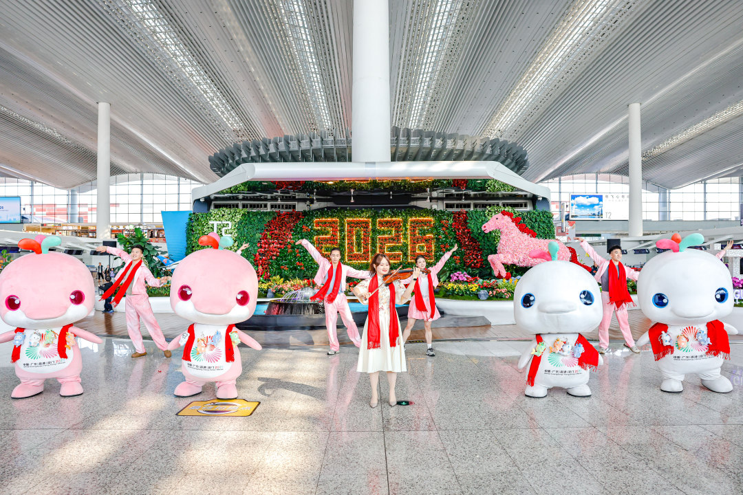 2月2日,春运启动首日,一场融合“文艺赋美城市·广货行天下·暖心春运”三大主题的新春快闪在广州白云国际机场T2航站楼欢乐上演。“顶流萌宠”大湾鸡惊喜亮相,与广州市属文艺院团的艺术家共同带来一场兼具岭南韵味与时代气息的文艺演出,为往来旅客献上一份独特的“广式文化年礼”,将广州这座城市的温暖,传递给每一位奔赴团圆的人。