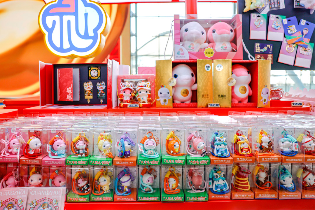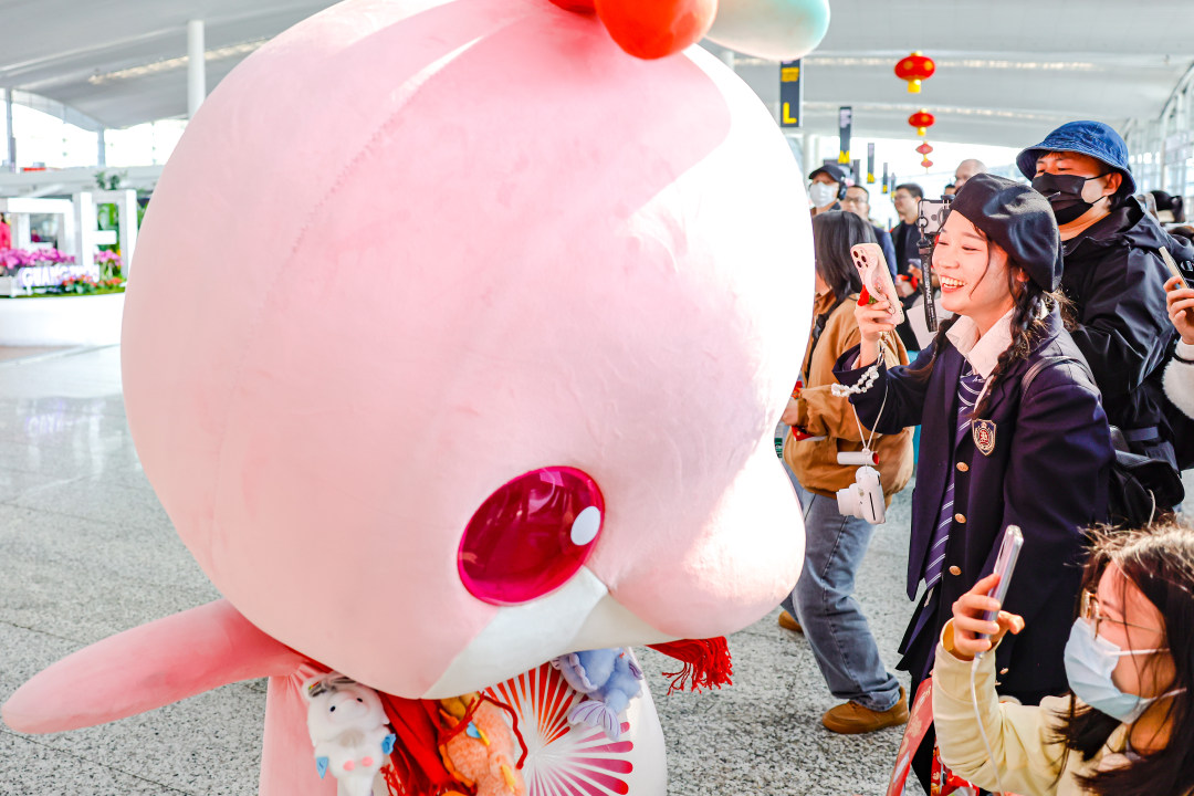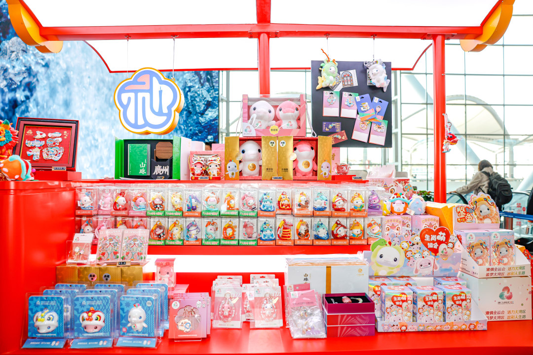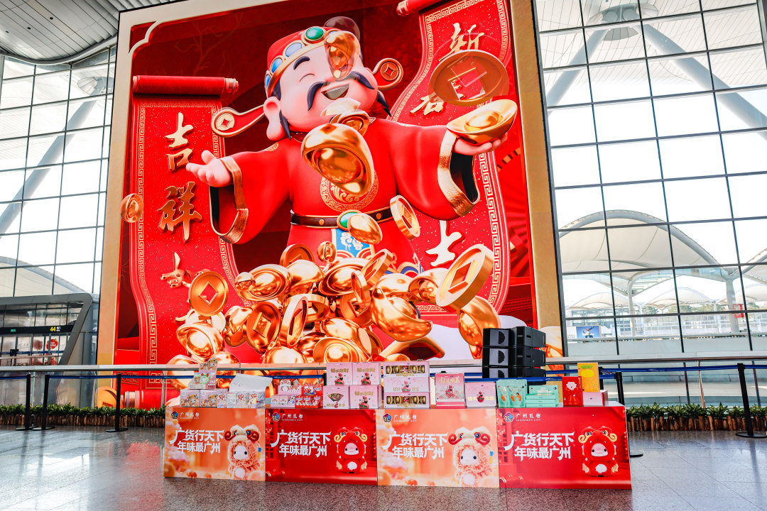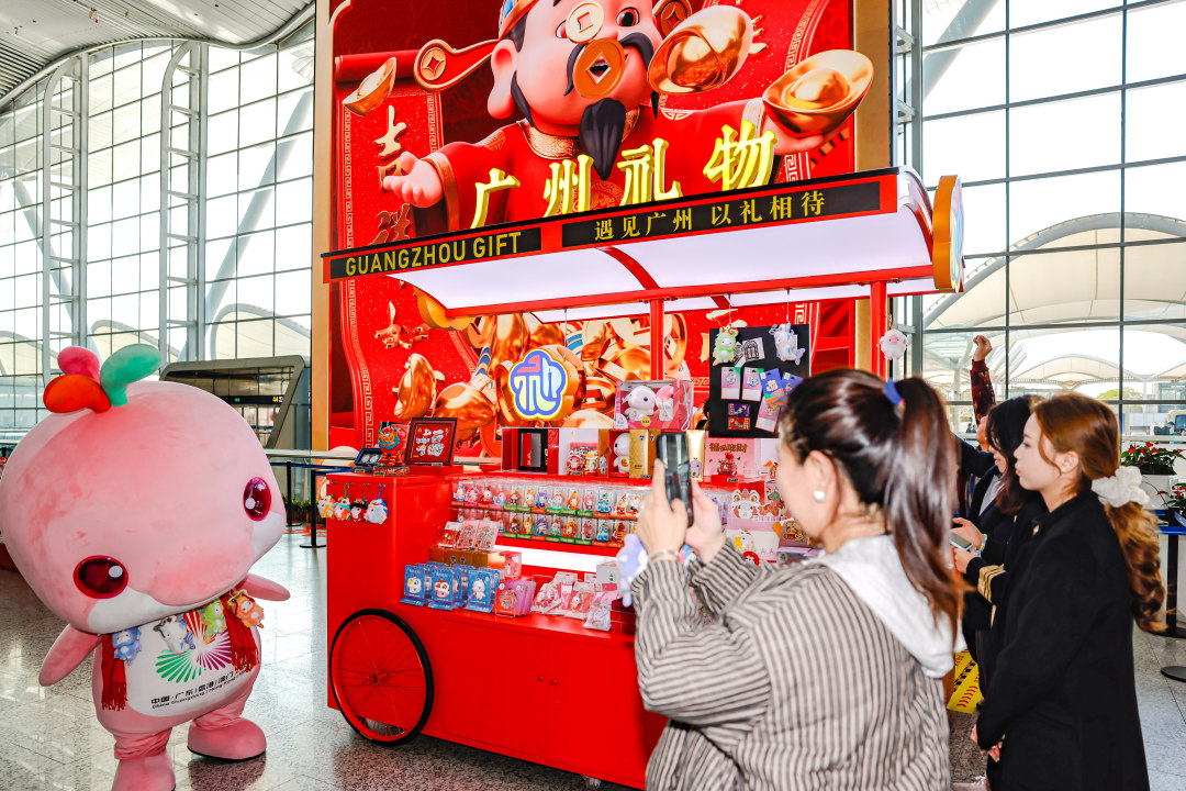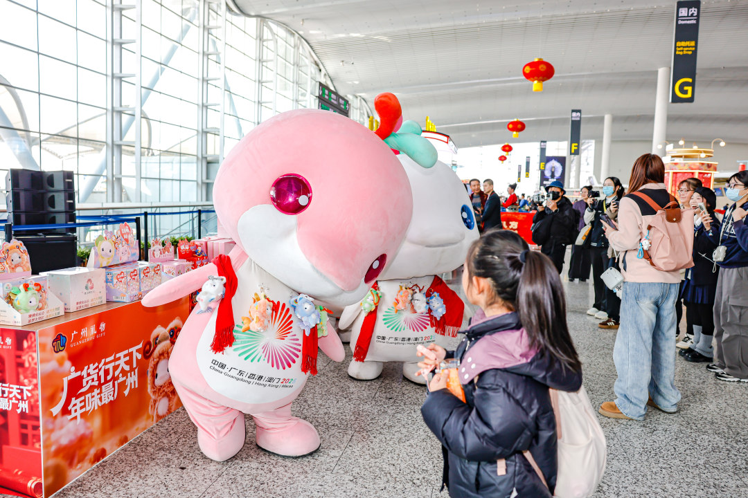 伴随着充满年味的欢快旋律,佩戴新年红围巾的“大湾鸡”在“广州礼物”机场快闪店前俏皮起舞,以“拜年”“比心”等可爱造型,瞬间吸引旅客驻足打卡。