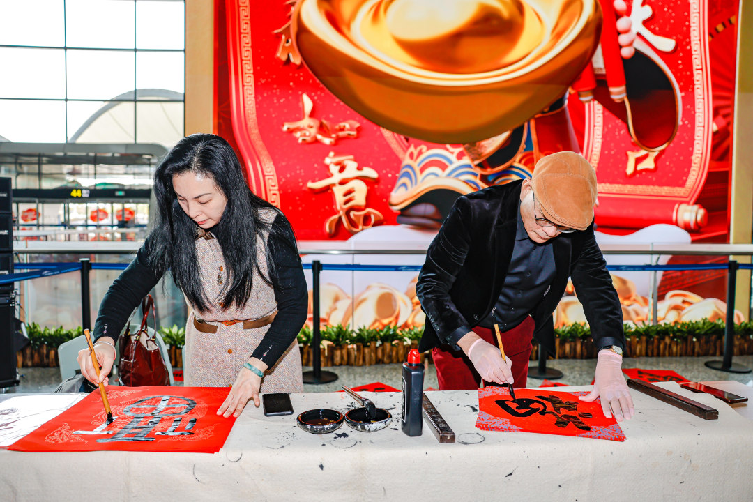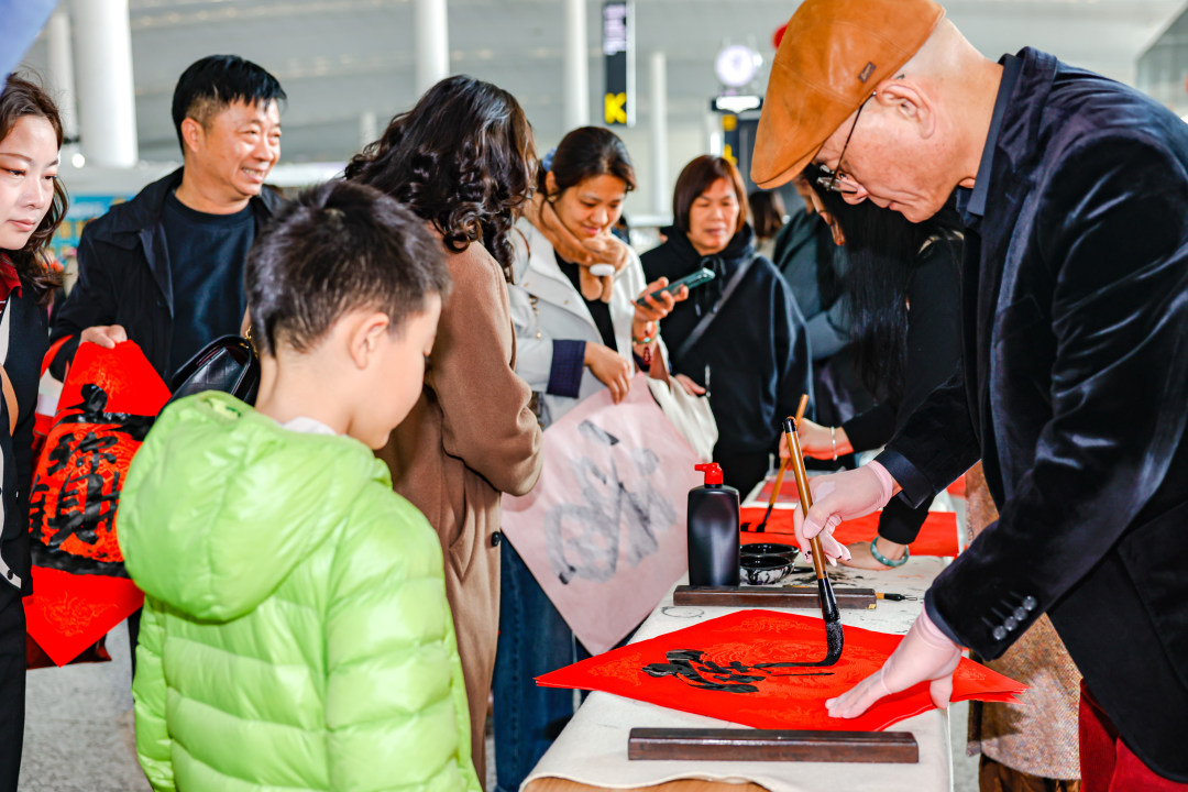 现场还有书法家现场挥毫,一幅幅饱满的“福”字承载祝愿,送入旅客手中。
