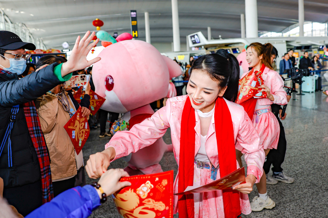 快闪演员们向旅客赠送了特别设计的马年定制版“福”字。