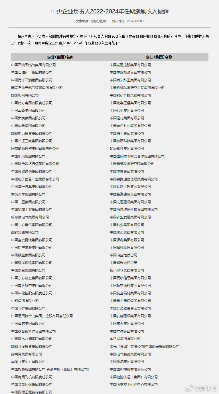 据国务院国有资产监督管理委员会网站,按照中央企业负责人薪酬管理有关规定,中央企业负责人薪酬总收入由年度薪酬和任期激励收入构成,其中,任期激励收入每三年发放一次。现将中央企业负责人2022-2024年任期激励收入公开。