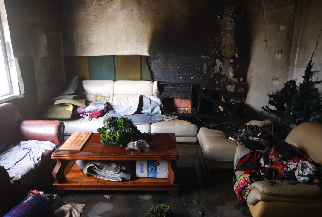 值得关注的是,实验现场还特意布置了节日装饰物以及部分杂物,这些看似常见的物品,在火灾中却成了“助燃帮凶”,加速了火情扩大。实验结束后,现场景象触目惊心:沙发上放置的折叠电热毯一角被完全烧穿,周边装饰材料和堆放杂物均已炭化烧毁,天花板布满乌黑的烟熏痕迹,呈现了火灾的惊人破坏力和蔓延速度。