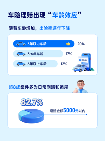 值得注意的是,车险理赔呈现出明显的“车龄效应”。随着车辆使用年限增加,出险率逐年下降。数据显示,车龄3年以内的新车出险率最高,达到20%,相当于每5辆新车中就有1辆理赔,而6年以上车龄的车辆出险率则降至12%。
