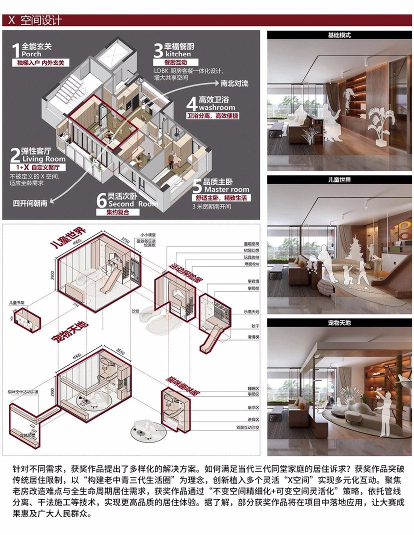 设计在完整保留社区古树、院落肌理等集体记忆的同时,通过植入“弹性客厅”(X空间),系统优化厨卫布局与采光通风,创造性满足了全龄友好、代际和谐的现代生活需求,生动诠释了“存量提质增效”的内涵。