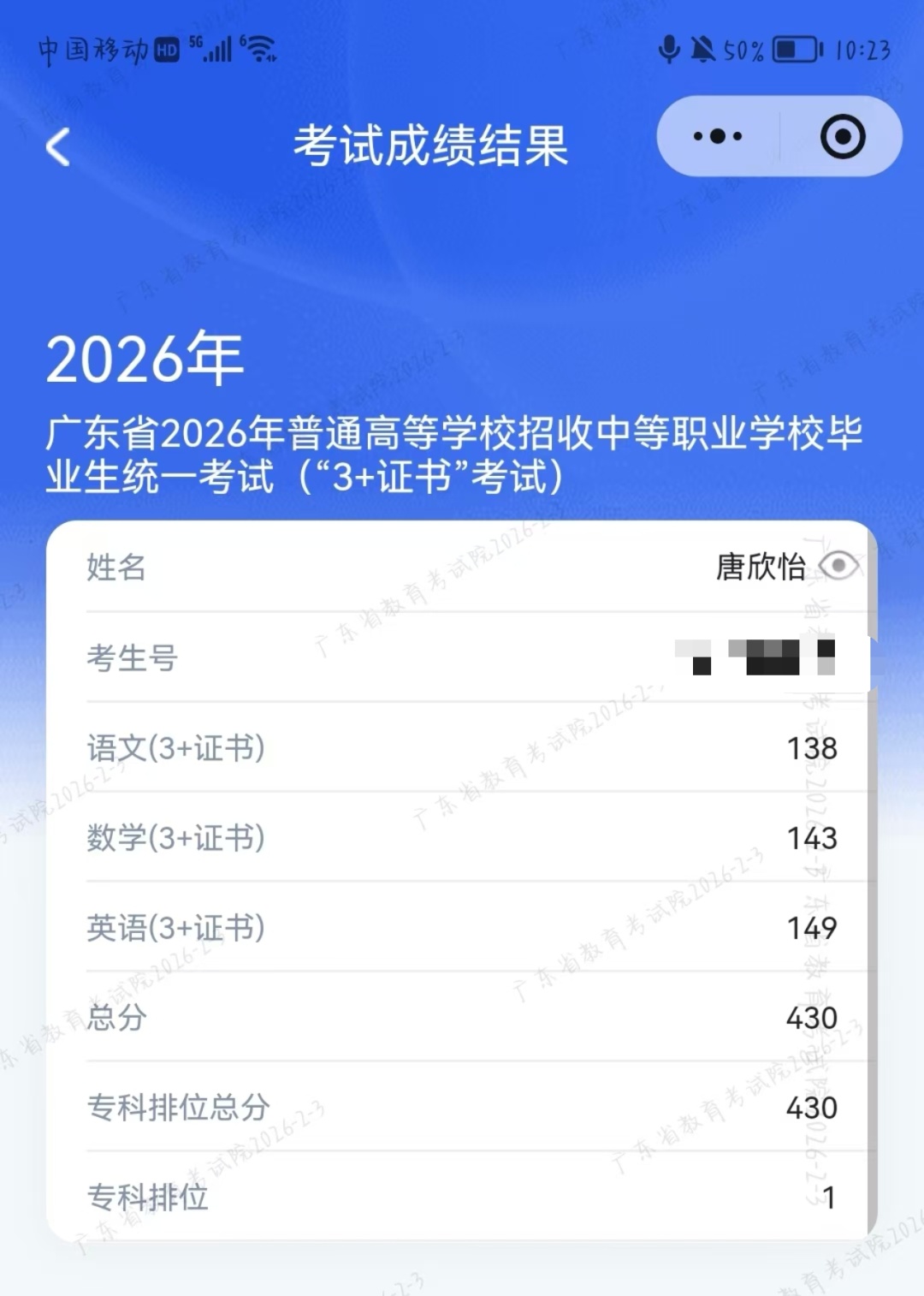 2月3日,2026年广东春季高考正式放榜。广州日报新花城记者获悉,在“3+证书”(语数英三科+技能证书)考试中,来自东莞市南博职业技术学校计算机应用专业的唐欣怡同学,以430分(满分450分)的优异成绩斩获全省第一名。此外,广州多所学校也陆续传来多位考生超400分的喜讯。延续多年公益服务,广州高等学校春季招生现场咨询会将于3月14日在广州报业文化中心举行。