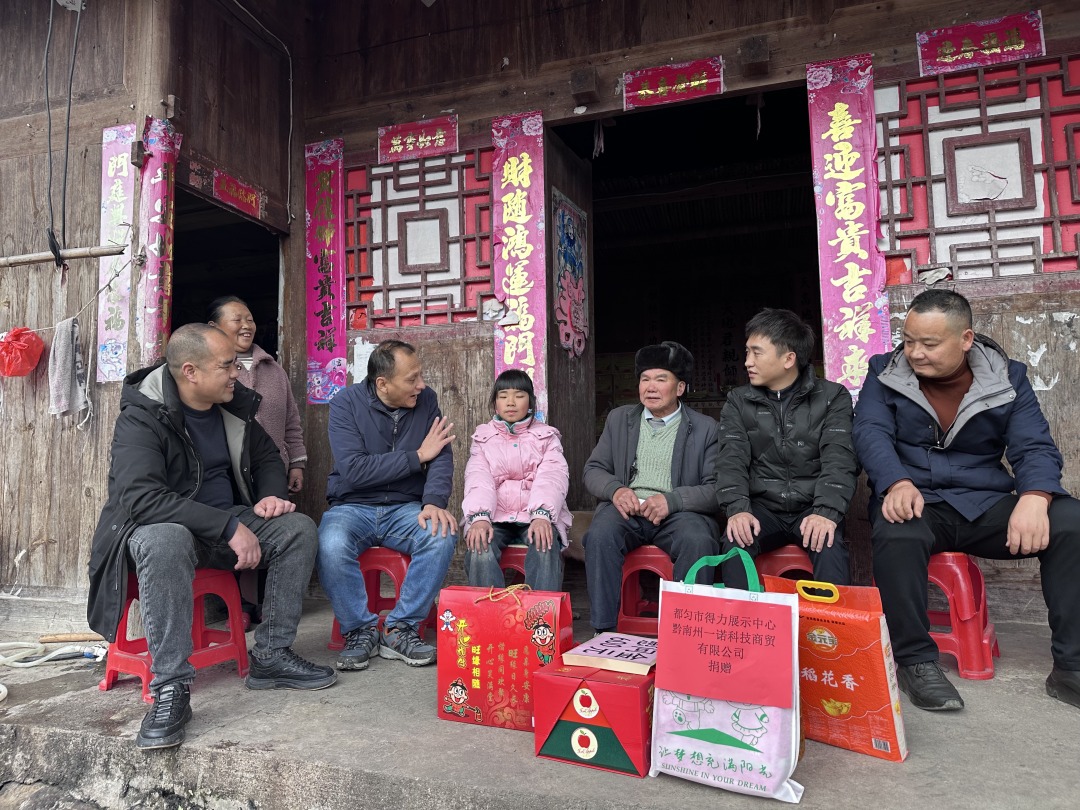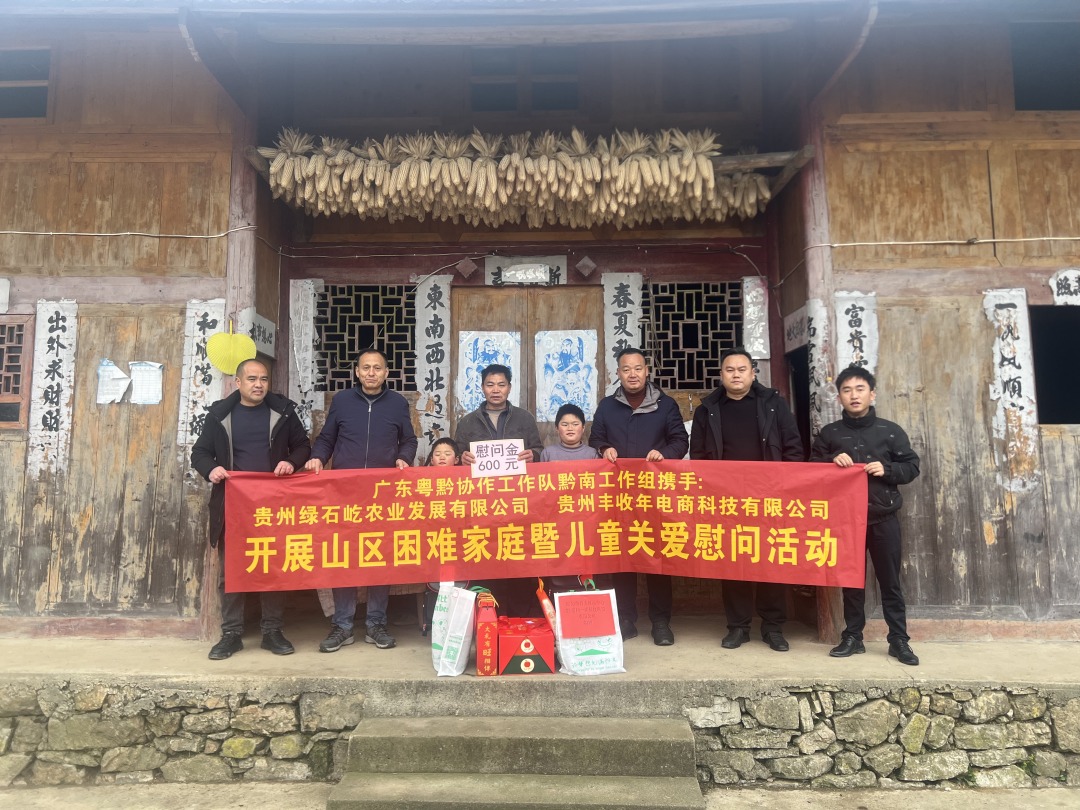 新春佳节临近,广东省粤黔协作工作队黔南工作组携手贵州绿石屹农业发展有限公司、贵州丰收年电商科技有限公司,走进都匀市绿茵湖街道斗篷山村,开展困难家庭及儿童关爱慰问活动,为困境群体送上新春关怀与物资支持。此外,工作组还代为转交了黔南州一诺科技商贸有限公司捐赠的学习用品,让爱心助力山区孩子成长。