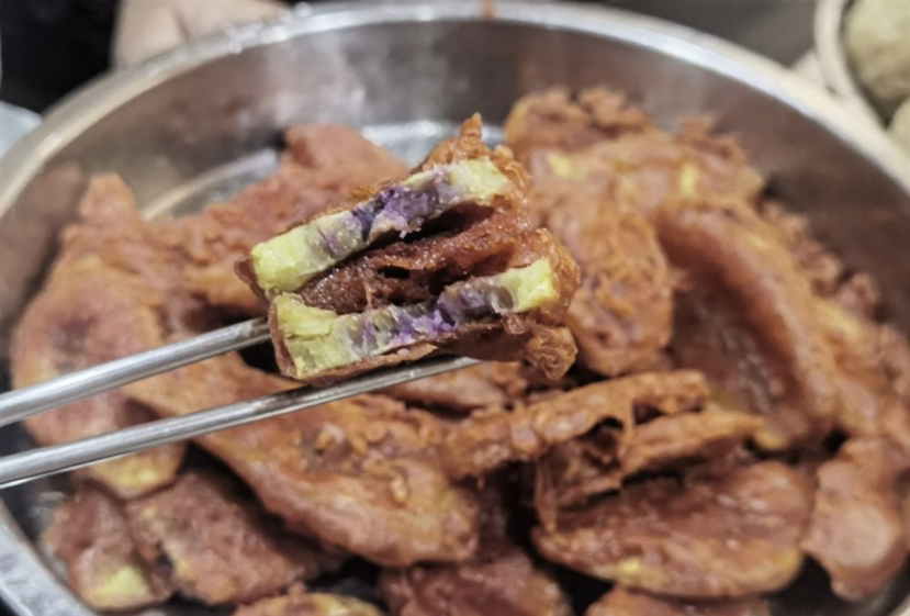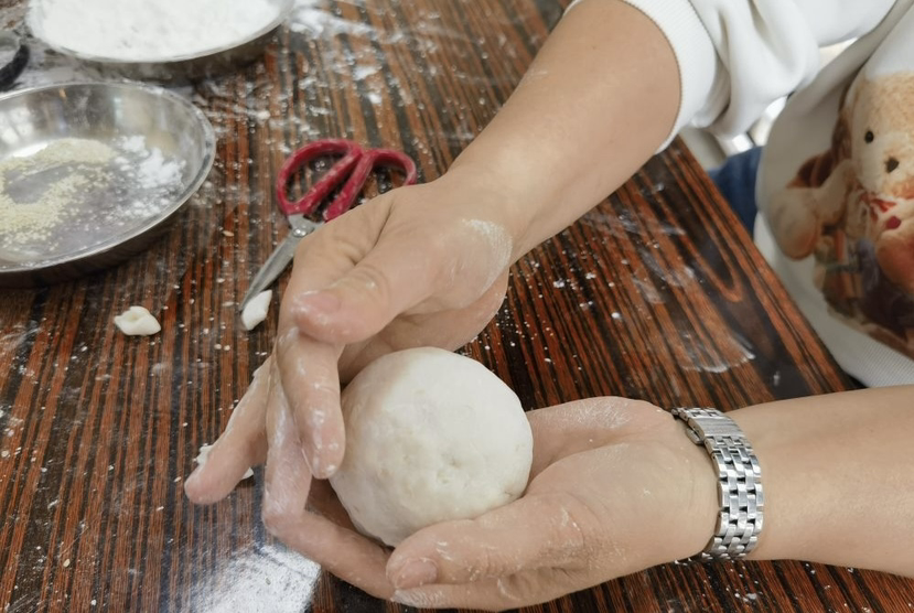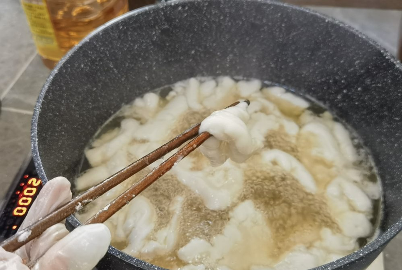 到了制作环节,讲究更多。和面时,需用滚烫的糖水先将一部分糯米粉烫熟,再趁热与生粉揉搓成团。这个过程极其烫手,但为了皮的口感软糯韧道,妈妈们总是笑着说自己练就了“铁砂掌”。聪明如霞姐,就会用“祖传”的扁竹条进行快速混合,不过当中阴柔发力却不是每个人都学得来,需要多年“修炼”。包馅时,需确保面皮完全包裹,不能留一丝缝隙,否则下油锅就会漏馅“开口笑”,便不完美了。