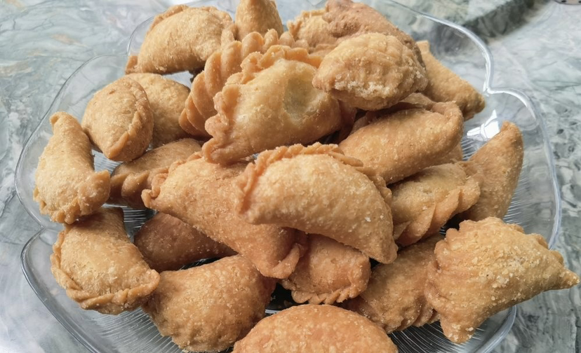 当金灿灿的煎堆堆满筛子,厨房里的油香盛宴还未结束。用剩下的面皮,巧手的妈妈们会变出各式花样,酥脆的油角(分脆角、酥角等多种)、咸香可口的咸水角,或是裹上芝麻的香甜蛋散。