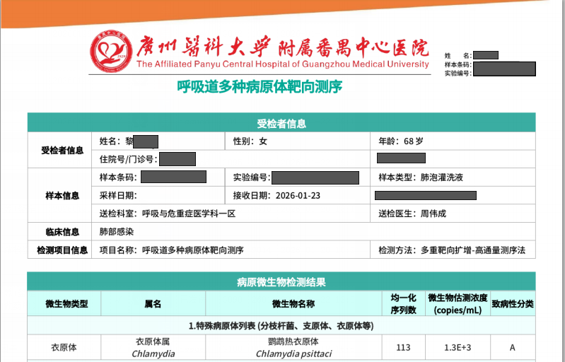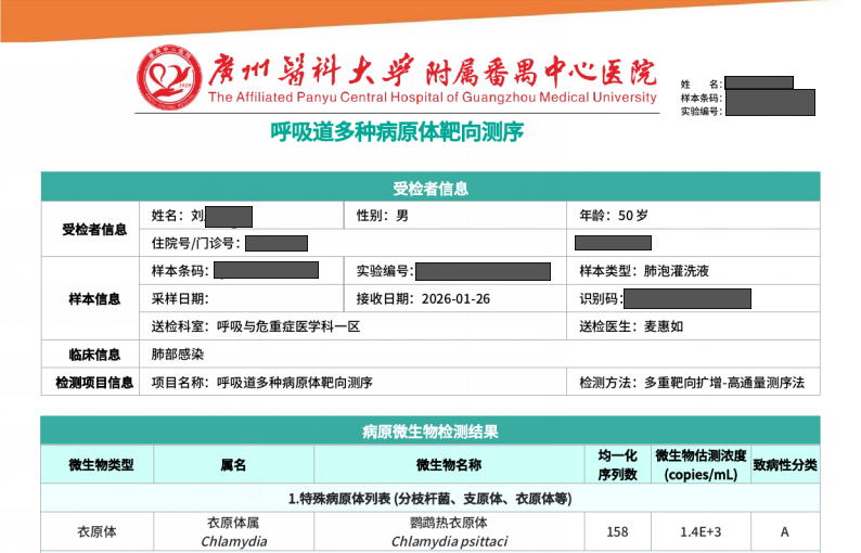 记者获悉,最近10天内,广医附属番禺中心医院呼吸与危重医学科一区连续接诊两例持续高热、肺部广泛感染的病例,经诊断均为鹦鹉热衣原体肺炎。