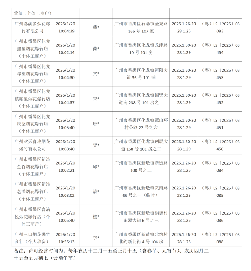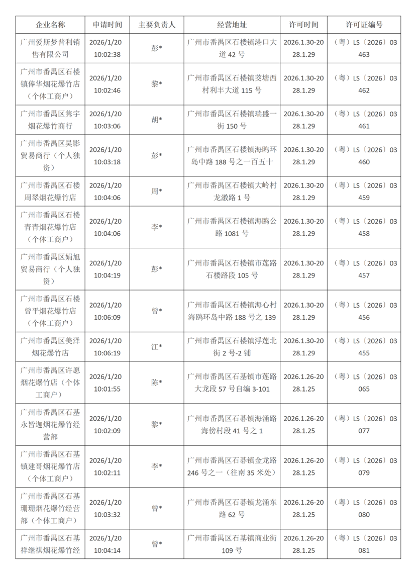 2026年第一批番禺区烟花爆竹经营(零售)许可名单