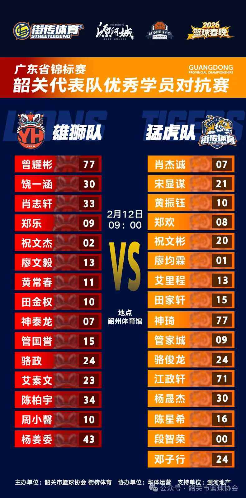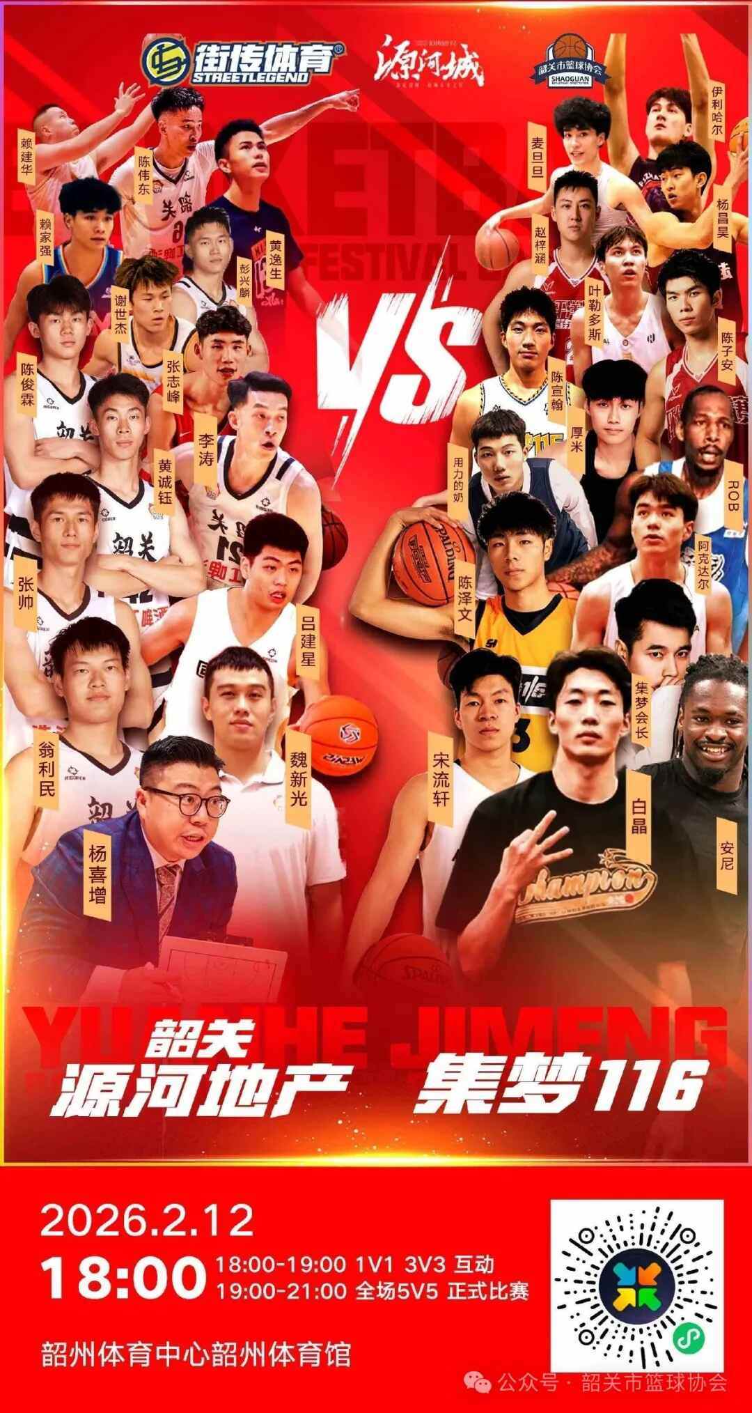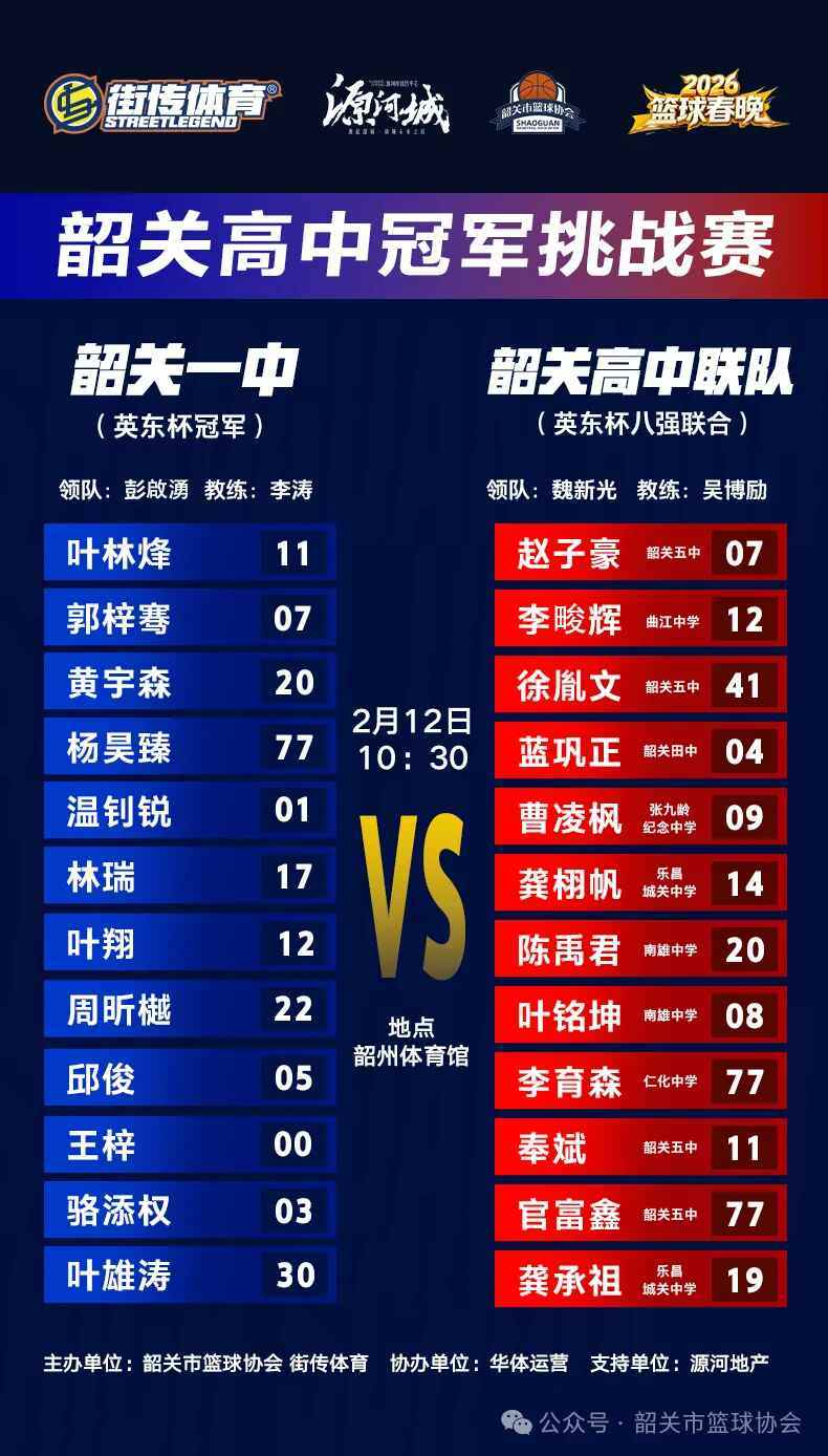 新春将至,篮球燃动。2月12日,由韶关市篮球协会、韶关市街传体育文化传播有限公司、源河地产联合主办的2026韶关篮球春晚,将在韶州体育馆激情上演。一场融合高水平竞技、全民互动与新春氛围的篮球盛宴,即将点燃韶城。