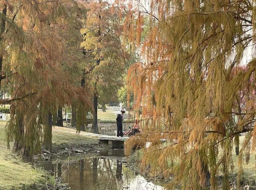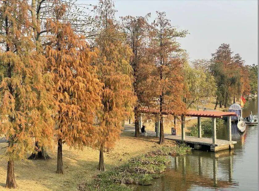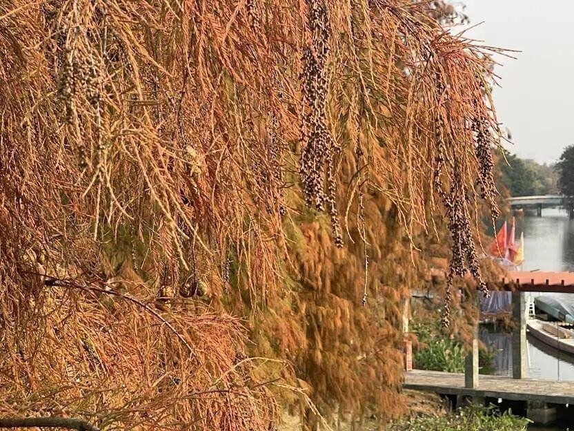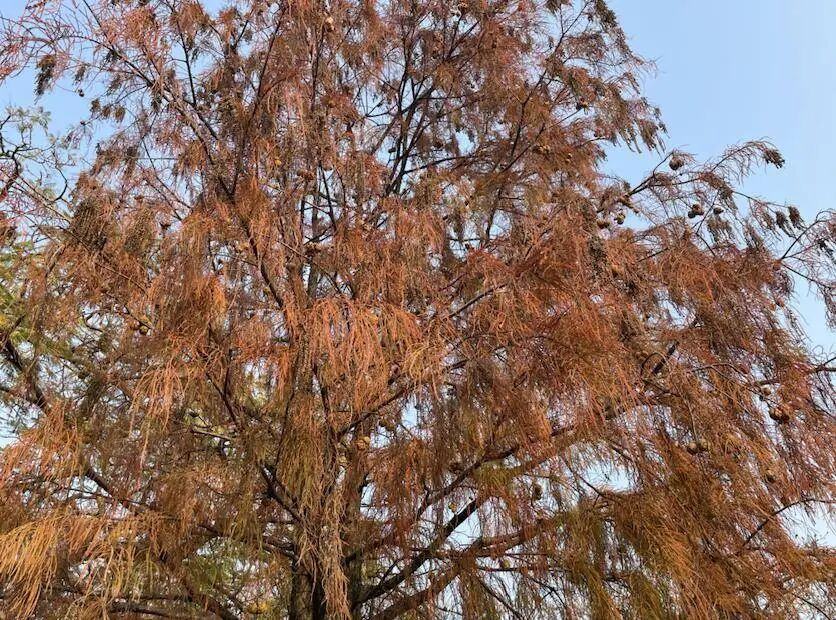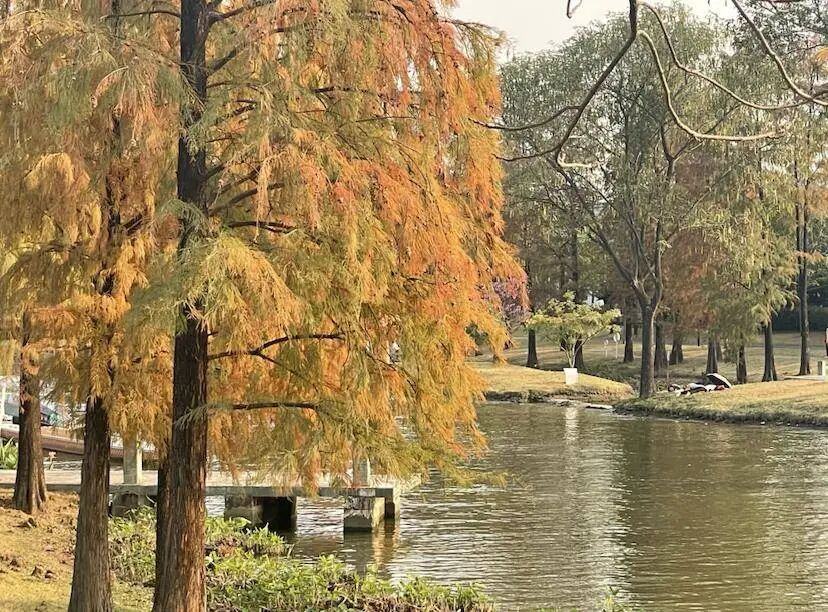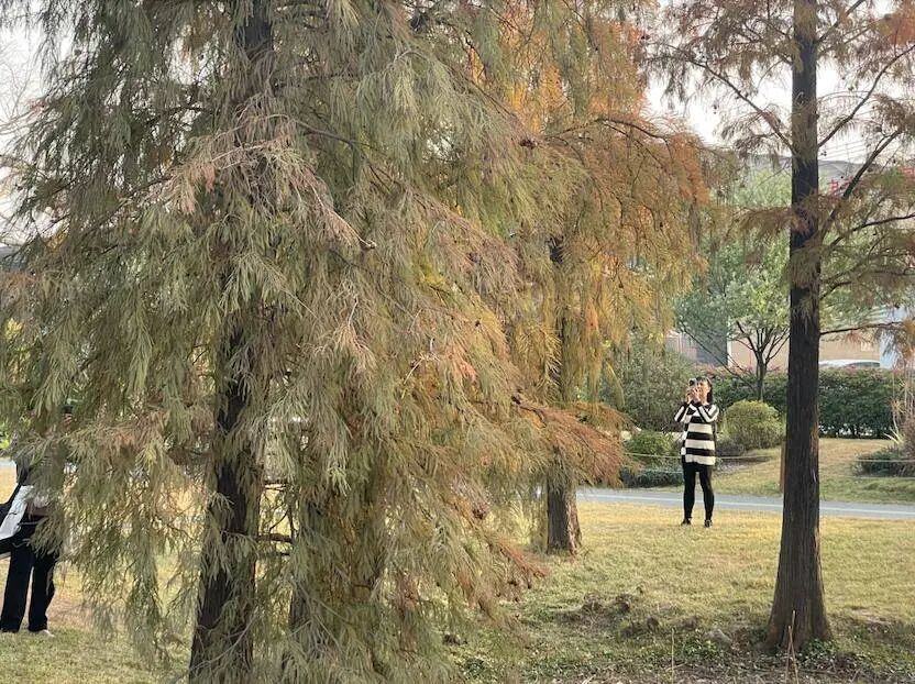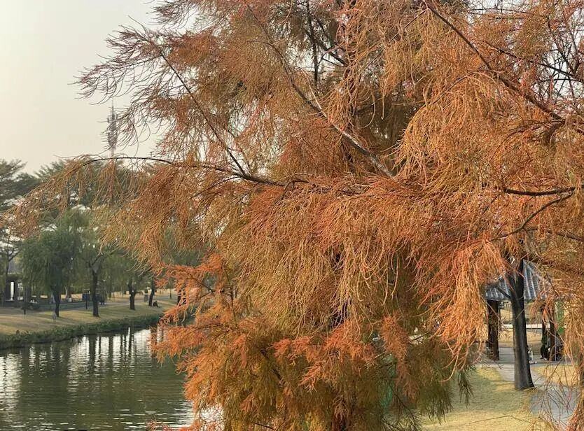 落羽杉的枝叶泛着金黄,