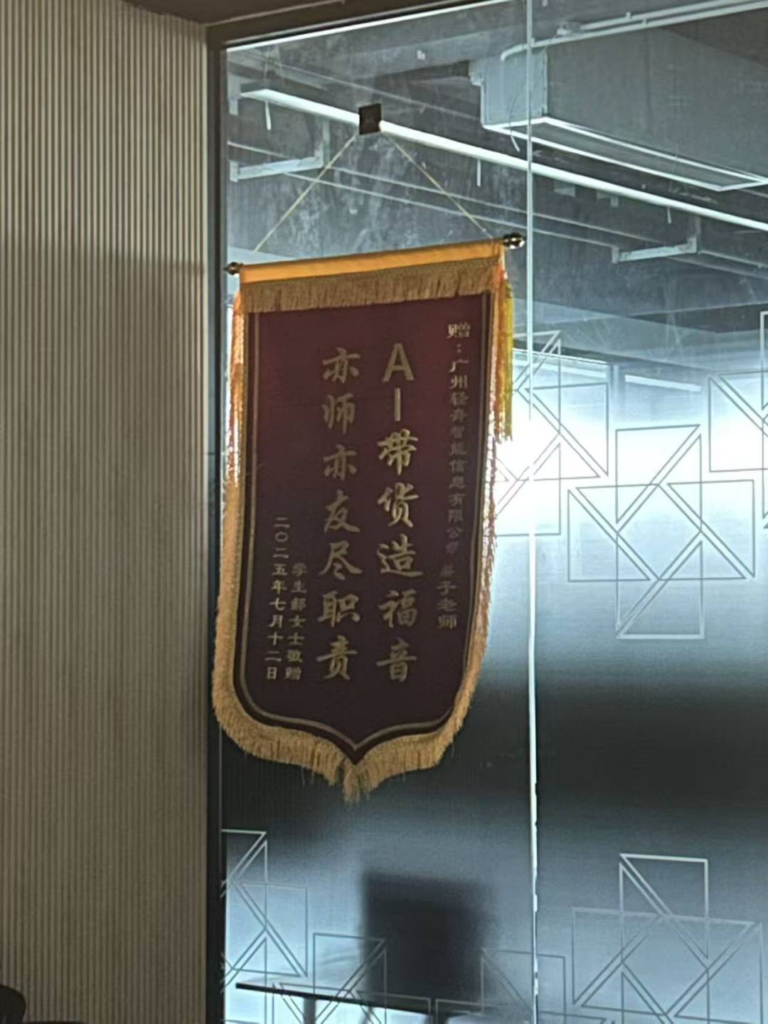“AI带货造福音,亦师亦友尽职责”。在被公安机关查封的“广州轻舟智能信息有限公司”内,这面红底黄字的锦旗,隔着玻璃门依然格外醒目。